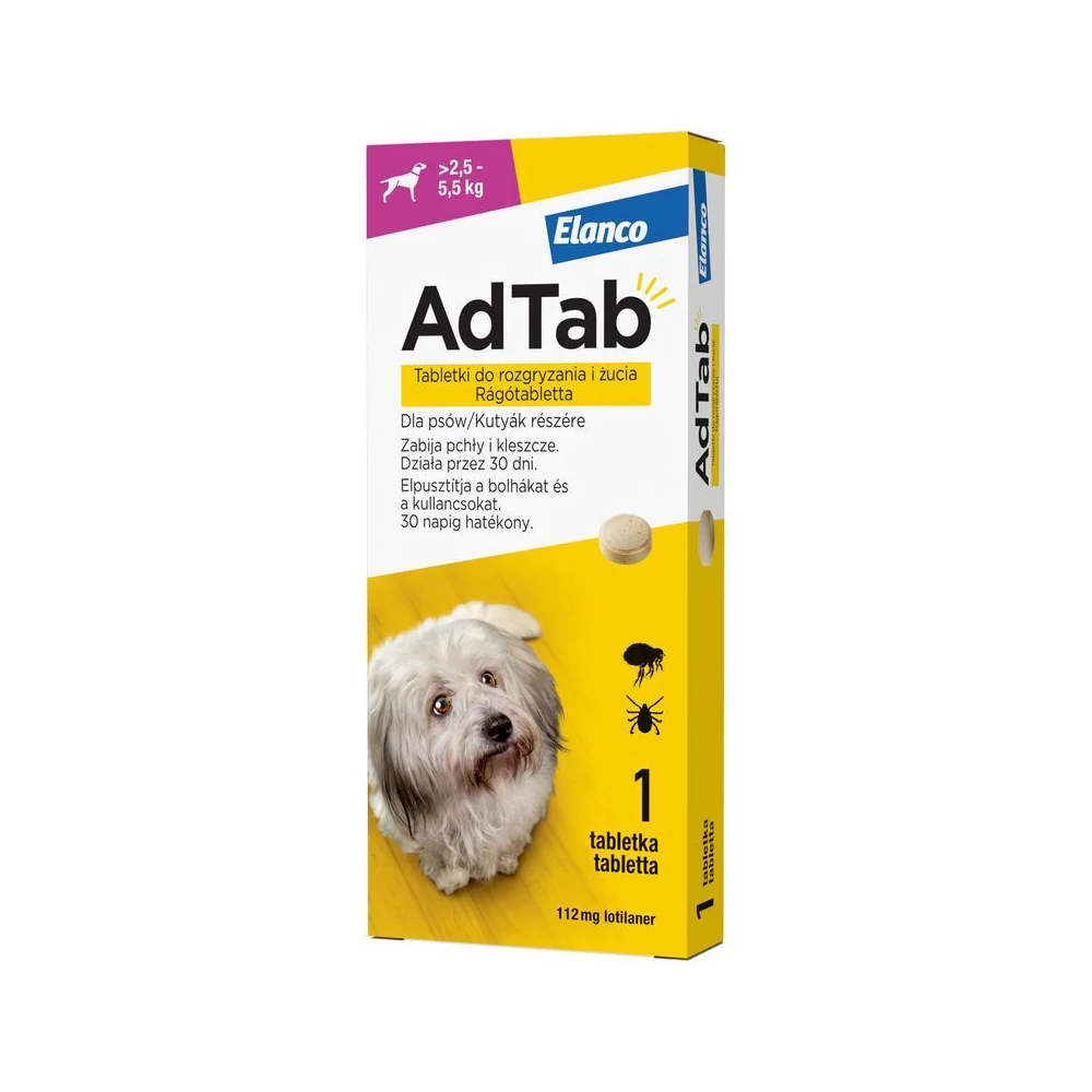 [AdTab rágótabletta] AdTab rágótabletta kis testű kutyáknak, bolha- és kullancsfertőzöttségének kezelésére Az állatgyógyászati készítmény azonnali és tartós ölő hatással bír 1 hónapon keresztül bolhák (Ctenocephalides felis és C. canis) és kullancsok (Rhipicephalus sanguineus, Ixodes ricinus, I. hexagonus és Dermacentor reticulatus) esetében. A bolháknak és a kullancsoknak meg kell kapaszkodniuk a gazdaállaton és el kell kezdeniük a táplálkozást, hogy a hatóanyaggal érintkezésbe kerülhessenek. Az állatgyógyászati készítmény neve, és besorolása AdTab 112 mg rágótabletta kutyák részére (> 2,5–5,5 kg) Állatorvosi vény nélkül kiadható állatgyógyászati készítmény Minőségi és mennyiségi összetétel Hatóanyag: Minden rágótabletta tartalmaz: AdTab rágótabletta lotilaner (mg) kutyák részére (> 2,5–5,5 kg) 112,5 Segédanyagok: A segédanyagok és egyéb összetevők minőségi összetétele Cellulózpor Laktóz-monohidrát Mikrokristályos cellulóz, szilikátos Száraz húsaroma Kroszpovidon Povidon K30 Nátrium-lauril-szulfát Kolloid szilícium-dioxid, vízmentes Magnézium-sztearát Fehér-bézs színű, kerek rágótabletta barna pöttyökkel. KLINIKAI ADATOK Célállat faj(ok) Kutya Ellenjavallatok Nem alkalmazható a hatóanyaggal, vagy bármely segédanyaggal szembeni túlérzékenység esetén. Különleges figyelmeztetések A parazitáknak el kell kezdeniük a táplálkozást a gazdaállaton, hogy a lotilanerrel érintkezésbe kerülhessenek, ezért a paraziták által terjesztett fertőző betegségek átvitelének a kockázata nem zárható ki. Figyelembe kell venni annak lehetőségét, hogy a háztartásban élő egyéb kedvenc állatok a bolhákkal való újrafertőződés forrásai lehetnek, és ezeket szükség szerint megfelelő készítménnyel kell kezelni. A bolhák minden fejlődési stádiumban megfertőzhetik a kutya fekhelyét és rendszeres pihenőhelyeit, például a szőnyegeket és a puha bútorszöveteket. Tömeges bolhafertőzés esetén és az ellenintézkedések megkezdésekor ezeket a területeket megfelelő, környezetben alkalmazható szerrel kell kezelni, majd rendszeresen porszívózni. Az alkalmazással kapcsolatos különleges óvintézkedések Különleges óvintézkedések a célállatfajokban való biztonságos alkalmazáshoz A biztonságosságra és a hatékonyságra vonatkozó összes adat 8 hetes vagy annál idősebb, és 1,3 kg vagy annál nagyobb testtömegű kutyakölyköktől származik. Rendelkezésre álló adatok hiányában a 8 hetesnél fiatalabb vagy 1,3 kg-nál kisebb testtömegű kutyák kezelése előtt egyeztessen az állatorvossal. Az állatok kezelését végző személyre vonatkozó különleges óvintézkedések A készítmény alkalmazása után kezet kell mosni. Véletlen lenyelés esetén haladéktalanul orvoshoz kell fordulni, bemutatva a készítmény használati utasítását vagy címkéjét. Mellékhatások Célállat faj: kutya Nagyon ritka (10 000 kezelt állatból kevesebb mint 1-nél jelentkezik, beleértve az izolált eseteket is): Hasmenés[1](https://www.grandopet.hu/#_ftn1),[2](https://www.grandopet.hu/#_ftn2), Hányás1,2, Étvágytalanság1,2, Letargia2, Ataxia3, Remegés3, Görcsök3 Fontos a mellékhatások bejelentése. Ez lehetővé teszi az állatgyógyászati készítmény biztonságosságának folyamatos nyomon követését. A jelentéseket lehetőség szerint az állatorvoson keresztül kell elküldeni a forgalomba hozatali engedély jogosultja felé, vagy a nemzeti mellékhatás figyelő rendszeren keresztül az illetékes nemzeti hatóság felé. Lásd még a használati utasítás „Kapcsolattartási adatok” pontját. Vemhesség, laktáció idején történő alkalmazás Az állatgyógyászati készítmény ártalmatlansága nem igazolt vemhesség és laktáció idején. Vemhesség és laktáció: Patkányokon végzett laboratóriumi vizsgálatok szerint a készítmény nem rendelkezik bizonyított teratogén hatással, illetve nem fejt ki káros hatást a hímek és a nőstények reprodukciós képességére. Vemhesség és szoptatás ideje alatt a kezelés megkezdése előtt, egyeztessen az állatorvossal. Termékenység: Tenyészkutyáknál a kezelés megkezdése előtt egyeztessen az állatorvossal. Gyógyszerkölcsönhatások és egyéb interakciók Nem ismert. A klinikai kísérletek során a lotilaner és a rutinszerűen alkalmazott állatgyógyászati készítmények között kölcsönhatás nem volt megfigyelhető. Az alkalmazás módja és az adagolás Szájon át történő alkalmazásra. Az állatgyógyászati készítményt a következő táblázatnak megfelelően kell adagolni a 20–43 mg lotilaner/testtömeg kg adag biztosításához. Kutya testtömege (kg) A tabletta erőssége és a beadandó tabletták szám a AdTab 56 mg AdTab 112 mg AdTab 225 mg AdTab 450 mg AdTab 900 mg 1,3–2,5 1 > 2,5–5,5 1 > 5,5–11,0 1 > 11,0–22,0 1 > 22,0–45,0 1 > 45 A tabletták megfelelő kombinálása 45 kg-nál nagyobb testtömegű kutyák esetében a rendelkezésre álló erősségek megfelelő kombinációját kell alkalmazni, hogy az ajánlott 20–43 mg/kg-os adagot elérje. Az aluldozírozás hatástalan használatot eredményezhet, és elősegítheti a rezisztencia kialakulását. A helyes adagolás biztosítása érdekében a testtömeget a lehető legpontosabban kell meghatározni. A AdTab a kutyák számára kellemesen ízesített rágótabletta. A rágótablettá(ka)t havonta egy alkalommal etetéskor vagy etetés után kell alkalmazni. A kullancs és bolhafertőzések optimális kontrollálására az állatgyógyászati készítményt havi gyakorisággal kell alkalmazni, és a helyi epidemiológiai helyzet alapján kell folytatni a bolha- és/vagy a kullancsszezon alatt. A túladagolás tünetei (valamint – adott esetben – sürgősségi intézkedések és antidotumok) Nem észleltek mellékhatást sz