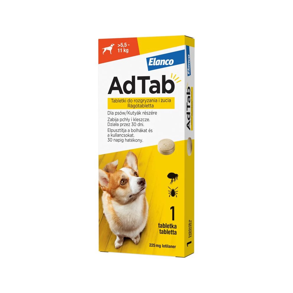 [AdTab rágótabletta] AdTab rágótabletta közepes testű kutyáknak, bolha- és kullancsfertőzöttségének kezelésére Az állatgyógyászati készítmény azonnali és tartós ölő hatással bír 1 hónapon keresztül bolhák (Ctenocephalides felis és C. canis) és kullancsok (Rhipicephalus sanguineus, Ixodes ricinus, I. hexagonus és Dermacentor reticulatus) esetében. A bolháknak és a kullancsoknak meg kell kapaszkodniuk a gazdaállaton és el kell kezdeniük a táplálkozást, hogy a hatóanyaggal érintkezésbe kerülhessenek. Az állatgyógyászati készítmény neve, és besorolása AdTab 225 mg rágótabletta kutyák részére (> 5,5–11 kg) Állatorvosi vény nélkül kiadható állatgyógyászati készítmény Minőségi és mennyiségi összetétel Hatóanyag: Minden rágótabletta tartalmaz: AdTab rágótabletta lotilaner (mg) kutyák részére (> 5,5–11 kg) 225 Segédanyagok: A segédanyagok és egyéb összetevők minőségi összetétele Cellulózpor Laktóz-monohidrát Mikrokristályos cellulóz, szilikátos Száraz húsaroma Kroszpovidon Povidon K30 Nátrium-lauril-szulfát Kolloid szilícium-dioxid, vízmentes Magnézium-sztearát Fehér-bézs színű, kerek rágótabletta barna pöttyökkel. KLINIKAI ADATOK Célállat faj(ok) Kutya Ellenjavallatok Nem alkalmazható a hatóanyaggal, vagy bármely segédanyaggal szembeni túlérzékenység esetén. Különleges figyelmeztetések A parazitáknak el kell kezdeniük a táplálkozást a gazdaállaton, hogy a lotilanerrel érintkezésbe kerülhessenek, ezért a paraziták által terjesztett fertőző betegségek átvitelének a kockázata nem zárható ki. Figyelembe kell venni annak lehetőségét, hogy a háztartásban élő egyéb kedvenc állatok a bolhákkal való újrafertőződés forrásai lehetnek, és ezeket szükség szerint megfelelő készítménnyel kell kezelni. A bolhák minden fejlődési stádiumban megfertőzhetik a kutya fekhelyét és rendszeres pihenőhelyeit, például a szőnyegeket és a puha bútorszöveteket. Tömeges bolhafertőzés esetén és az ellenintézkedések megkezdésekor ezeket a területeket megfelelő, környezetben alkalmazható szerrel kell kezelni, majd rendszeresen porszívózni. Az alkalmazással kapcsolatos különleges óvintézkedések Különleges óvintézkedések a célállatfajokban való biztonságos alkalmazáshoz A biztonságosságra és a hatékonyságra vonatkozó összes adat 8 hetes vagy annál idősebb, és 1,3 kg vagy annál nagyobb testtömegű kutyakölyköktől származik. Rendelkezésre álló adatok hiányában a 8 hetesnél fiatalabb vagy 1,3 kg-nál kisebb testtömegű kutyák kezelése előtt egyeztessen az állatorvossal. Az állatok kezelését végző személyre vonatkozó különleges óvintézkedések A készítmény alkalmazása után kezet kell mosni. Véletlen lenyelés esetén haladéktalanul orvoshoz kell fordulni, bemutatva a készítmény használati utasítását vagy címkéjét. Mellékhatások Célállat faj: kutya Nagyon ritka (10 000 kezelt állatból kevesebb mint 1-nél jelentkezik, beleértve az izolált eseteket is): Hasmenés[1](https://www.grandopet.hu/#_ftn1),[2](https://www.grandopet.hu/#_ftn2), Hányás1,2, Étvágytalanság1,2, Letargia2, Ataxia3, Remegés3, Görcsök3 Fontos a mellékhatások bejelentése. Ez lehetővé teszi az állatgyógyászati készítmény biztonságosságának folyamatos nyomon követését. A jelentéseket lehetőség szerint az állatorvoson keresztül kell elküldeni a forgalomba hozatali engedély jogosultja felé, vagy a nemzeti mellékhatás figyelő rendszeren keresztül az illetékes nemzeti hatóság felé. Lásd még a használati utasítás „Kapcsolattartási adatok” pontját. Vemhesség, laktáció idején történő alkalmazás Az állatgyógyászati készítmény ártalmatlansága nem igazolt vemhesség és laktáció idején. Vemhesség és laktáció: Patkányokon végzett laboratóriumi vizsgálatok szerint a készítmény nem rendelkezik bizonyított teratogén hatással, illetve nem fejt ki káros hatást a hímek és a nőstények reprodukciós képességére. Vemhesség és szoptatás ideje alatt a kezelés megkezdése előtt, egyeztessen az állatorvossal. Termékenység: Tenyészkutyáknál a kezelés megkezdése előtt egyeztessen az állatorvossal. Gyógyszerkölcsönhatások és egyéb interakciók Nem ismert. A klinikai kísérletek során a lotilaner és a rutinszerűen alkalmazott állatgyógyászati készítmények között kölcsönhatás nem volt megfigyelhető. Az alkalmazás módja és az adagolás Szájon át történő alkalmazásra. Az állatgyógyászati készítményt a következő táblázatnak megfelelően kell adagolni a 20–43 mg lotilaner/testtömeg kg adag biztosításához. Kutya testtömege (kg) A tabletta erőssége és a beadandó tabletták szám a AdTab 56 mg AdTab 112 mg AdTab 225 mg AdTab 450 mg AdTab 900 mg 1,3–2,5 1 > 2,5–5,5 1 > 5,5–11,0 1 > 11,0–22,0 1 > 22,0–45,0 1 > 45 A tabletták megfelelő kombinálása 45 kg-nál nagyobb testtömegű kutyák esetében a rendelkezésre álló erősségek megfelelő kombinációját kell alkalmazni, hogy az ajánlott 20–43 mg/kg-os adagot elérje. Az aluldozírozás hatástalan használatot eredményezhet, és elősegítheti a rezisztencia kialakulását. A helyes adagolás biztosítása érdekében a testtömeget a lehető legpontosabban kell meghatározni. A AdTab a kutyák számára kellemesen ízesített rágótabletta. A rágótablettá(ka)t havonta egy alkalommal etetéskor vagy etetés után kell alkalmazni. A kullancs és bolhafertőzések optimális kontrollálására az állatgyógyászati készítményt havi gyakorisággal kell alkalmazni, és a helyi epidemiológiai helyzet alapján kell folytatni a bolha- és/vagy a kullancsszezon alatt. A túladagolás tünetei (valamint – adott esetben – sürgősségi intézkedések és antidotumok) Nem észleltek mellékhatást s