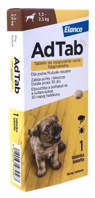 Az AdTab egy ízletes és könnyen beadható rágótabletta kutyák részére, ami egy hónapos védelmet nyújt kutyádnak bolhák és kullancsok ellen. Gyors, kényelmesen alkalmazható és közvetlenül megvásárolható, vény nélkül.