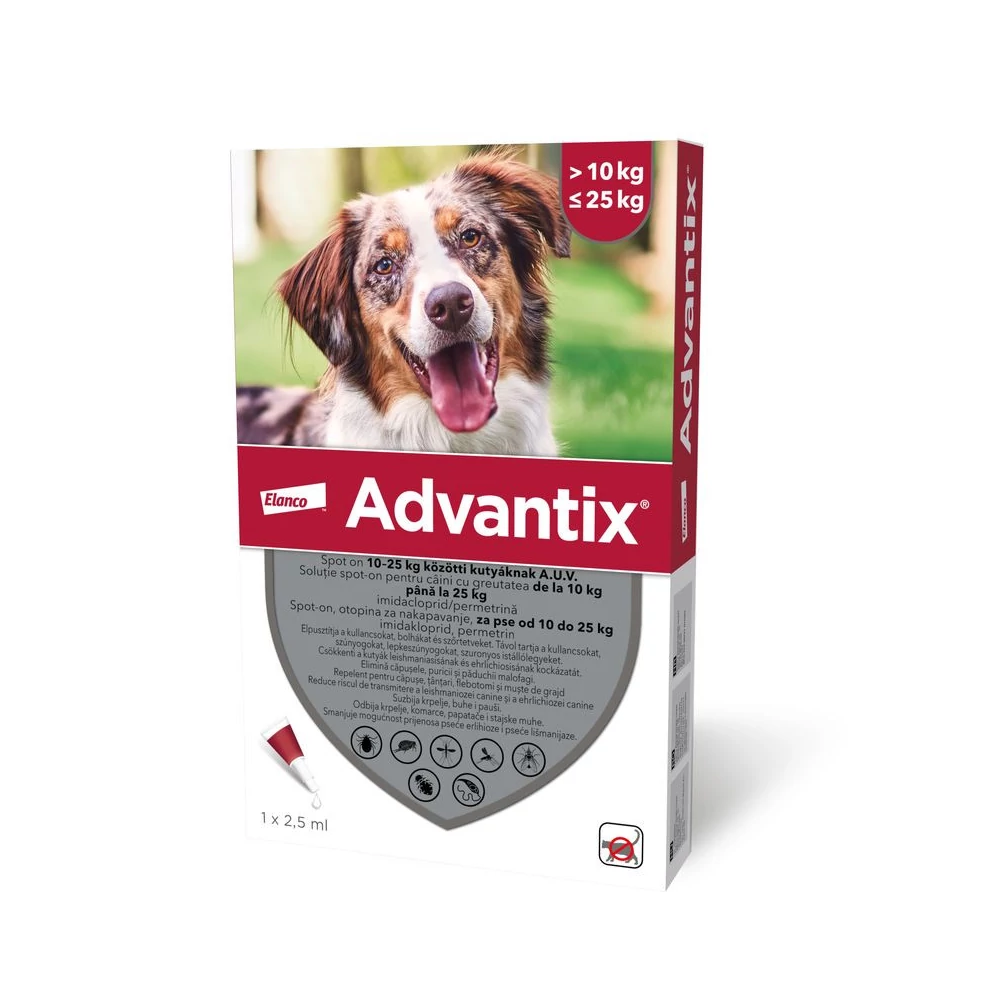 Hatóanyag: Imidakloprid 100 mg/ml, permetrin 500 mg/ml Célállat faj: kutya Javallat: Rácsepegtető oldat. Kutya bolhásság (Ctenocephalides felis, Ctenocephalides canis) kezelésére és megelőzésére. A kutyán élősködő bolhák a kezelést követő egy napon belül elpusztulnak. Egy kezelés 4 hétig véd az újrafertőződés ellen. A készítmény felhasználható a bolhacsípés okozta allergiás bőrgyulladás (FAD) kezelési programjának részeként. Szőrtetvesség (Trichodectes canis) gyógykezelésére. A termék négy héten át fennmaradó akaricid és repellens hatással rendelkezik Rhipicephalus sanguineus, Ixodes ricinus kullancsok, és három hétig tartó aktivitással rendelkezik Dermacentor reticulatus kullancsfaj esetén. A kezelés időpontjában a kutyán lévő kullancsok a kezelés után még két napig is életben maradhatnak, láthatóak maradnak a kutya bőrébe fúródva Adagolás: az állat testtömegének megfelelő hatáserősségű pipetta tartalmát csorgassa az állat bőrére, nyakra, a gerinc vonalában Kiszerelés: 1x Advantix spot on 40-60 kg közötti kutyáknak A.U.V. 1.AZ ÁLLATGYÓGYÁSZATI KÉSZÍTMÉNY NEVE Advantix spot on 40-60 kg közötti kutyáknak A.U.V. 2.MINŐSÉGI ÉS MENNYISÉGI ÖSSZETÉTEL Minden 6,0 ml-es tubus tartalmaz: Hatóanyagok: Imidakloprid: 600,0 mg Permetrin (40/60): 3000,0 mg Segédanyagok: Butil-hidroxitoluol (E321): 6,0 mg A segédanyagok teljes felsorolását lásd: 6.1 szakasz. 3. GYÓGYSZERFORMA Rácsepegtető oldat Tiszta, sárgásbarna oldat. 4. KLINIKAI JELLEMZŐK 4.1 Célállat faj Kutya (40-60 kg között) A 40 kg-os vagy az alatti és 60 kg feletti kutyák részére használja a megfelelő méretű Advantix spot on-t vagy a tubusok megfelelő kombinációját (lásd 4.9 szakaszt). 4.2 Terápiás javallatok célállat fajonként Bolhásság (Ctenocephalides felis, Ctenocephalides canis) kezelésére és megelőzésére. A kutyán élősködő bolhák a kezelést követő egy napon belül elpusztulnak. Egy kezelés 4 hétig véd az újrafertőződés ellen. A készítmény felhasználható a bolhacsípés okozta allergiás bőrgyulladás (FAD) kezelési programjának részeként. Szőrtetvesség (Trichodectes canis) gyógykezelésére. A termék négy héten át fennmaradó akaricid és repellens hatással rendelkezik Rhipicephalus sanguineus, Ixodes ricinus kullancsok, és három hétig tartó aktivitással rendelkezik Dermacentor reticulatus kullancsfaj esetén. A Rhipicephalus sanguineus kullancsfaj elleni repellens és ölő hatás miatt a készítmény csökkenti a patogén Ehrlichia canis átvitelének valószínűségét, ezáltal az ehrlichiosis kockázatát. A kockázat csökkenését vizsgálattal igazolták, mely során kimutatták, hogy a hatás a készítmény alkalmazását követő 3. naptól 4 hétig tart. A kezelés időpontjában a kutyán lévő kullancsok a kezelés után még két napig is életben maradhatnak, láthatóak maradnak a kutya bőrébe fúródva. Ezért javasolt a kullancsok eltávolítása a kezelés időpontjában a további vérszívás megakadályozása céljából. Egy kezelés elegendő a repellens (táplálkozás ellenes) hatás eléréséhez lepkeszúnyogok (Phlebotomus papatasi ellen két hétig illetve Phlebotomus perniciosus ellen három hétig) esetén, igazi szúnyogok közül Aedes aegypti esetén két hétig, Culex pipiens esetén négy hétig, valamint szuronyos istállólégy (Stomoxys calcitrans) ellen négy hétig. A készítmény csökkenti a lepkeszúnyogok (Phlebotomus perniciosus) által terjesztett Leishmania infantum fertőzés kockázatát, legfeljebb 3 hétig. A hatás közvetett, mivel a készítmény a vektorral szemben hatékony. 4.3 Ellenjavallatok Rendelkezésre álló adatok hiányában a készítményt 7 hetesnél fiatalabb és 40 kg-nál kisebb testtömegű kutyákon használni tilos. Nem használható a hatóanyagokkal vagy egyéb összetevőkkel szembeni ismert túlérzékenység esetén. Macskáknak nem adható. (lásd még a 4.5 szakaszt- Az alkalmazással kapcsolatos különleges óvintézkedések) 4.4 Különleges figyelmeztetések minden célállat fajra vonatkozóan Egy-egy vérszívó, kullancs, lepkeszúnyog vagy igazi szúnyog megtapadása lehetséges. Emiatt ezen paraziták által közvetített fertőző betegségek átadását kedvezőtlen körülmények között nem lehet teljes mértékben kizárni. Ajánlott a kezelést legalább 3 nappal a lehetséges E. canis fertőződés előtt elvégezni. Tekintettel az E. canisra, vizsgálattal igazolták, hogy a kutyák ehrlichiosisának kockázata csökken az E. canis-al fertőzött Rhipicephalus sanguineus kullancsok megtelepedése estén a kezelést követő 3. naptól 4 héten át. A lepkeszúnyogok csípése elleni azonnali védelmet nem dokumentálták. A lepkeszúnyogok (Phlebotomus perniciosus) által terjesztett, Leishmania infantum okozta fertőzés kockázatának csökkentése érdekében a kezelt kutyákat védett környezetben kell tartani a kezdeti kezelést követő első 24 órában. 4.5 Az alkalmazással kapcsolatos különleges óvintézkedések i) A kezelt állatokra vonatkozó különleges óvintézkedések Ügyeljünk rá, hogy a tubus tartalma ne kerülhessen a kezelendő állat szemébe, szájába. Ügyeljünk a helyes alkalmazásra (Ld. Adagolás és alkalmazás módja 4.9 szakaszt). Különösen fontos, hogy megakadályozzuk a kezelés helyének nyalogatását, ezzel a készítmény szájon át való felvételét, mind a kezelt, mind az azzal együtt tartott állatok által. Macskákat a készítménnyel kezelni tilos! Ez a készítmény macskákra különösen mérgező, adagolása végzetes lehet, mert a macskák különleges élettani sajátosságuk miatt képtelenek bizonyos anyagok, közöttük a permetrin lebontására. A macskák véletlen mérgeződésének megakadályozása céljából a kezelt kutyákat távol kell tartani a macskáktól, amí