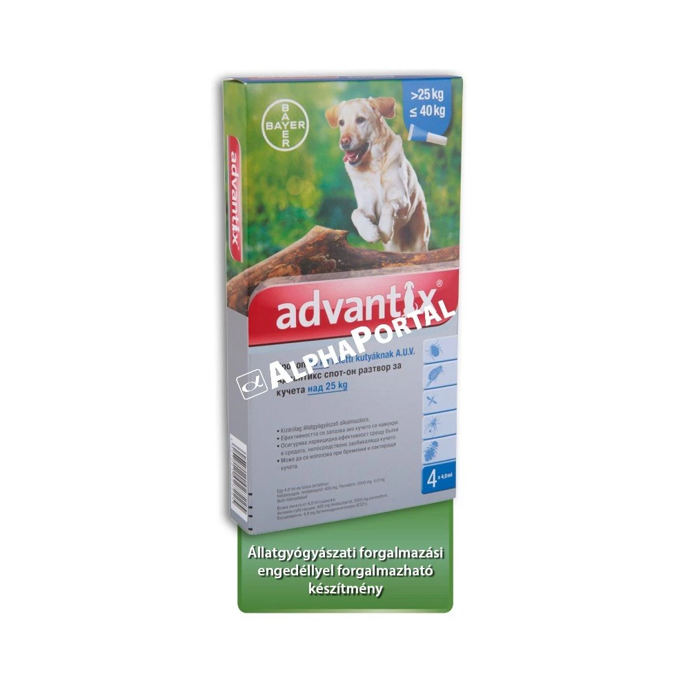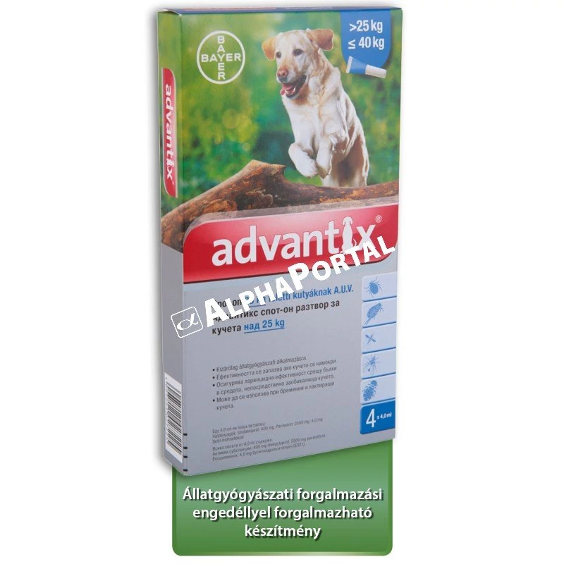 ["Az] Advantix 400 bolha- és kullancsirtó csepegtető oldat 25-40 kg-os kutya számára - 4x4 ml A bolhásság (Ctenocephalides felis, Ctenocephalides canis) kezelésére és megelőzésére, valamint szőrtetvesség (Trichodectes canis) kezelésére javasolt[élősködők elleni készítmény](%5C%22https://www.grandopet.hu/kutya/higienia-es-apolas/bolha-es-kullancs-ellenes-keszitmenyek?cat_dd=277%5C%22)az Advantix csepegtető oldat 25-40 kg testtömegű kutya számára adagolható. Az Advantix 400 bolha- és kullancsirtó csepegtetőoldat hatása A kutyán élősködő bolhák a kezelést követő egy napon belül elpusztulnak. - Egy kezelés 4 hétig véd az újrafertőződés ellen. - A készítmény felhasználható a bolhacsípés okozta allergiás bőrgyulladás (FAD) kezelési programjának részeként. - A termék négy héten át fennmaradó akaricid és repellens hatással rendelkezik: - Rhipicechalus sanguineus, - Ixodes ricinus kullancsok, - és három hétig tartó aktivitással rendelkezik Dermacentor reticulatus kullancsfaj esetén. - A kezelés időpontjában a kutyán lévő kullancsok a kezelés után még két napig is életben maradhatnak, láthatóak maradnak a kutya bőrébe fúródva. Ezért javasolt a kullancsok eltávolítása a kezelés időpontjában a további vérszívás megakadályozása céljából. Egy kezelés elegendő a repellens (táplálkozás ellenes) hatás eléréséhez: - Lepkeszúnyogok közül: - Phlebotomus papatasi ellen két hétig - Phlebotomus perniciosus ellen három hétig, - Szúnyogok közül: - Aedes aegypti esetén két hétig, - Celux pipiens esetén négy hétig, - Szuronyos istállólégy (Stomoxys calcitrans) ellen négy hétig. Az Advantix 400 bolha- és kullancsirtó csepegtető oldat ellenjavallatai - Rendelkezésre álló adatok hiányában a készítményt 7 hetesnél fiatalabb és 1,5 kg- nál kisebb testtömegű kutyakölykökön használni tilos! - A kutya testtömegének megfelelő Advantix készítményt kell alkalmazni. - Nem használható a hatóanyagokkal vagy segédanyagokkal szembeni ismert túlérzékenység esetén! - Macskáknak nem adható! (További információk ezzel kapcsolatban a Különleges figyelmeztetéseknél olvasható.) Az Advantix 400 bolha- és kullancsirtó csepegtető oldat mellékhatásai Nagyon ritkán előfordulhat kutyákon: - Átmeneti bőrérzékenység a kezelés helyén: - fokozott viszketegség, - vakarózás, - dörzsölés, - szőrhullás és kipirulás - vagy levertség, ami általában magától elmúlik. - Nagyon ritka esetekben magatartásválozás: - izgatottság, - nyugtalanság, - nyüszítés, - hempergőzés, - Gyomor- bélrendszeri tünetek: - hányás, - hasmenés, - nyálzás, - étvágycsökkenés - Neurológiai tünetek, mint: - bizonytalan mozgás, - rángatózás jelentkezhetnek azoknál a kutyáknál, amelyek érzékenyek a permetrinre. Ezek a tünetek általában átmenetiek és maguktól elmúlnak. Kutyákban a véletlen lenyelést követően mérgezés valószínűtlen, de nagyon ritkán előfordulhat: - Ebben az esetben idegrendszeri tünetek jelentkezhetnek, mint remegés és letargia. - A kezelés tüneti. - Nincs ismert antidótum. Ha bármilyen súlyos mellékhatást tapasztal, vagy olyan mellékhatást, ami itt nem szerepel, kérjük, keresse fel az állatorvost. Az Advantix 400 bolha- és kullancsirtó csepegtető oldat összetétele - Ható- és segédanyagok megnevezése:Imidakloprid 100 mg/ml, Permetrin 500mg/ml. - Segédanyagok:Butil- hidroxitoluol (E321) 1,0 mg/ml. Az Advantix bolha- és kullancsirtó csepegtető oldat alkalmazása - Célállatfajok:Kutya. - Kiszerelés:1x - Adagolás, alkalmazási módok célállat fajonként:Az ajánlott legkisebb adag 10mg/testtömeg kg (ttkg) imidakloprid és 50 mg/ttkg permetrin. Testtömeg (kg) Termék neve(ml) Térfogat (ml) Imidakloprid (mg/ttkg) Permetrin (mg/ttkg) ? 4 kg Advantix spot on 4 kg alatti kutyáknak A.U.V. 0,4 ml 10 Min. 50 > 4 ? 10 kg Advantix spot on 4-10 kg közötti kutyáknak A.U.V. 1,0 ml 10-25 50-125 > 10 ? 25 kg Advantix spot on 10-25 kg közötti kutyáknak A.U.V. 2,5 ml 10-25 50-125 > 25 ? 40 kg Advantix spot on 25 kg feletti kutyáknak A.U.V. 4,0 ml 10-16 50-80 40 kg testtömeg fölött a tubusok megfelelő kombinációját kell használni. Egyéb tudnivalók az Advantix 400 bolha- és kullancsirtó csepegtető oldat alkalmazásáról - A betelepülő új bolhák által bekövetkező újrafertőződés megakadályozása céljából az együtt élő valamennyi kutya egyidejű kezelése szükséges. - A háztartásban élő egyéb kedvenc állat kezelése is szükséges valamilyen megfelelő termékkel. - A környezetből való újrafertőződés visszaszorítására javasolt a kutya környezetének egyidejű kezelése bolhák és fejődési alakjaik ellen ható szerrel. - A termék hatékony marad akkor is, ha a kutya szőrzete benedvesedik. - A szőrzet hosszan tartó, intenzív átnedvesedését azonban el kell kerülni. - Gyakori vízzel való érintkezés esetén a készítmény hatékonysága csökkenhet. - Ilyen esetekben ne ismételjük a kezelést gyakrabban, mint hetente egyszer. Ha kutyát samponnal fürdetni szükséges, javasolt ezt az Advantix spot on kezelést megelőzően, vagy az után két héttel megtenni, a készítmény kielégítő hatékonyságának biztosítása érdekében. - Szőrtetű fertőzöttség esetén a kezelés után 30 nappal ismételt állatorvosi vizsgálat javasolt, mert néhány esetben második kezelésre is szükség lehet. - Élelmezés – egészségügyi várakozási idő: Nem értelmezhető. - A készítmény nem fogyasztható! Az Advantix bolha- és kullancsirtó csepegtető oldat használata Az Advantix bolha- és kullancsirtó csepegtető oldat külsőleg, csak ép bőrfelületen alkalmazható. Egy helyre ne nyomjon túl sok oldatot, nehogy az lecsorogjon a[kutya](%5C%22https://www.grandopet.hu/kutya%5C%22)oldalán. - Vegyen ki egy tubust 