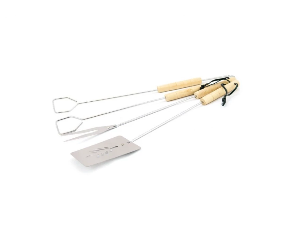 Praktikus grillezési kiegészítőkA grill tartozékkészlet fogókból, villából és spatulából áll.A konyhai kiegészítők ellenálló krómozott acélból készülnek.A barbecue kiegészítők előnye a fa fogantyúk és praktikus akasztók, amelyek lehetővé teszik a barbecue közelében történő tárolást.