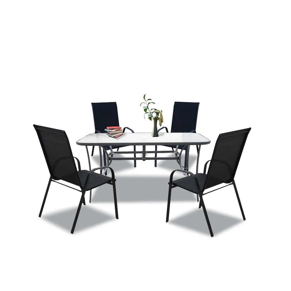 A modern kivitelű kerti bútorkészlet egy kerti üveglapos asztalt és 4 széket tartalmaz. A bútorokat 4 fő számára tervezték. A székek és az asztal lábazata fémből készül. Az asztallap 5 mm-es edzett üvegből készült, amely ellenáll a kisebb karcolásoknak. Az textilén szék ülésanyaga ellenáll az időjárási viszonyoknak. Előnye az ergonómikusan profilált ülés és karfa, amelyek tehermentesítik a vállakat pihenés közben.