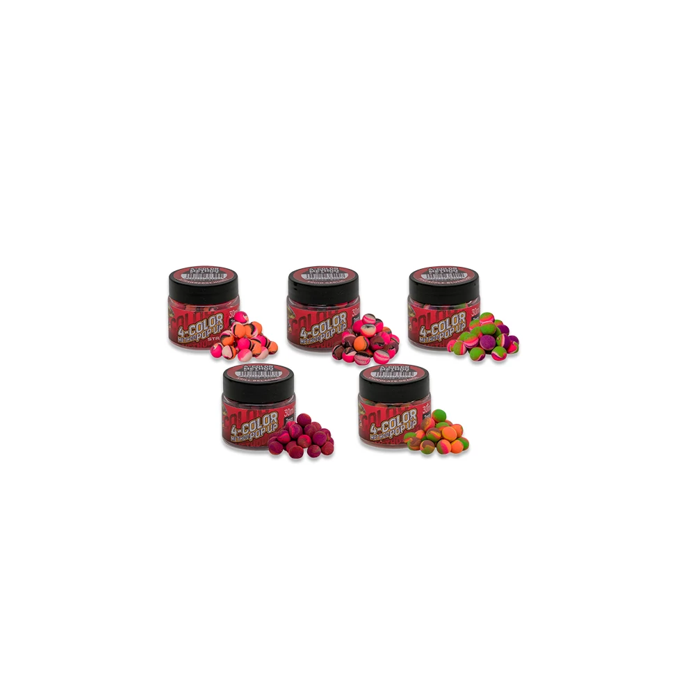 A Bicolor lebegő horgászcsalijaink eddig is rengeteg szép eredményt adtak és megelégedéssel használtuk mi is, megannyi horgásszal azonosan. Ezen sikerfaktort tovább gondolva, Benzár Zsolt még egyet csavarva a dolgon, továbbfejlesztette ezt a kombinációt, így született meg jelen termék, a 4Color Pop Up. Nevéből adódóan, ezek lebegő csalik,nagyobb felhajtóerővel, így természetesen önmagukban, de csalikombinációkat alkotva, kikönnyítésre is alkalmasak. Minden csaliszem 4 szín keverékéből áll össze, egy olyan egyedi összeállítást kreálva, mely minden fényviszony és áramlat mellett más és más arcát mutatja a víz alatt, a legóvatosabb és finoman táplálkozó békéshalakat is kapásra bírva. Csalitüskén és fűzve is használhatóak, 7 mm-es méretük, mondhatni univerzális felhasználási kört enged meg, de kifejezetten a method technika mellé ajánljuk. A csalik ízei tekintetében is vitt egy csavart a termékbe Zsolt, így a Krill-Belachan, markánsabb vonaltól, a kellemesebb Kókusz-Vaníliáig találhatóak variánsok a szériában.