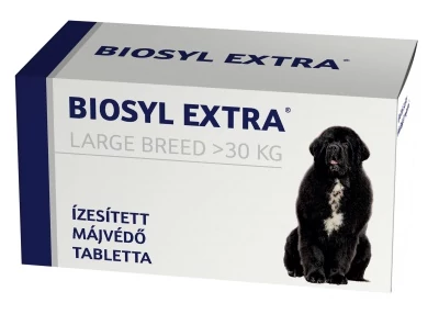 Kiegészítő állateledel - ízesített májvédő tabletta nagy testű (>30 kg) kutyák részére A Biosyl Extra tabletta hozzájárul az egészséges, normál májműködés fenntartásához, természetes összetevői támogatják a máj regenerációs folyamatait.