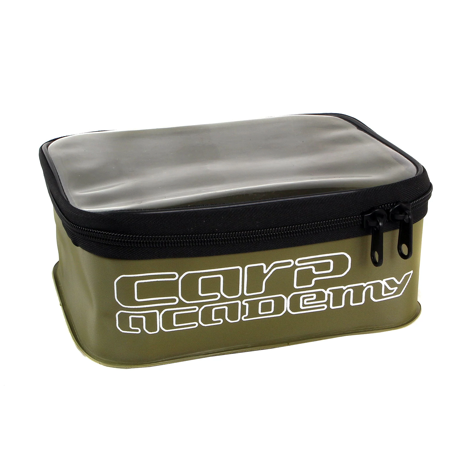 EVA anyagból készült szerelékes táska, pontyozó felszerelések tárolására. A táska anyaga kellően vastag és erős, bátran terhelhető. A dupla cipzár strapabíró típusú, amely hosszú távon is jól bírja a vízparti viszonyokat. Legnagyobb előnye a teljesen átlátszó tetőrész, amelyen keresztül beláthatunk a dobozunkba kinyitás nélkül is. Klasszikus, négyzetes alakja és mérete miatt ebből a típusból legfeljebb négy darab kiválóan elfér a Carp Academy EVA szerelékes táskába (5306-002)