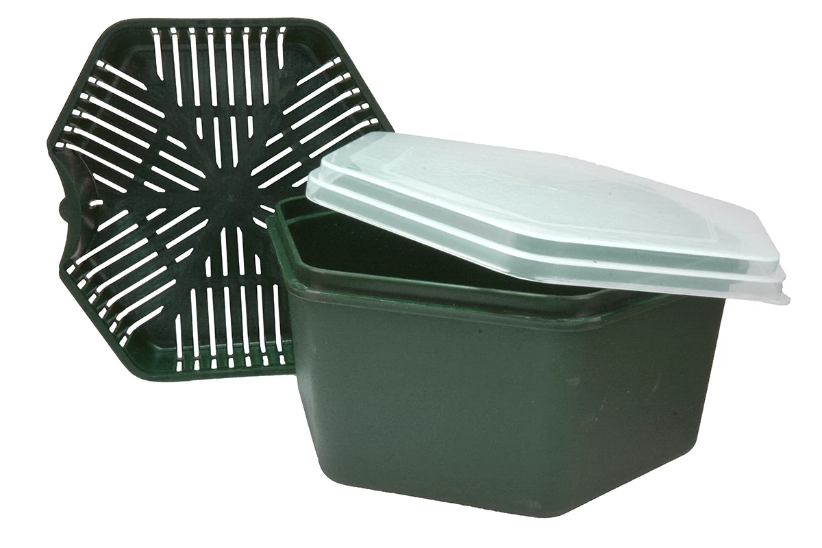 Hatszögletű csalisdoboz, átlátszó tetővel, és egy áztató/csepegtető tálcával, mely tökéletesen illeszkedik a doboz belsejébe.