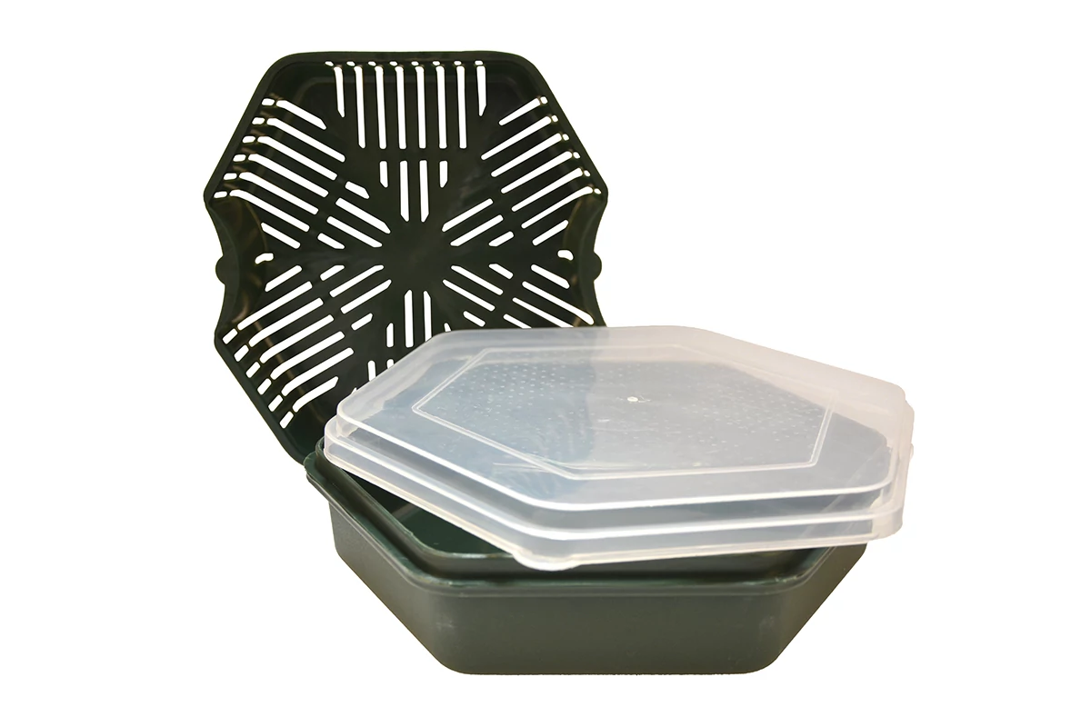 Hatszögletű csalisdoboz, átlátszó tetővel, és egy áztató/csepegtető tálcával, mely tökéletesen illeszkedik a doboz belsejébe.