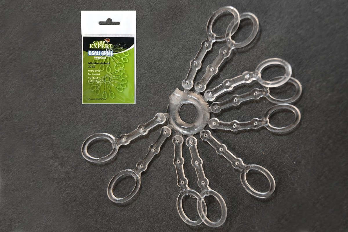 A Carp Expert csaligumi kimondottan lágy teljesen áttetsző szilikonból készül. Használatával jelentősen megnő a fogási esély, hiszen a horog gyakorlatilag szabadon marad, így az akadás sokkal tisztább, és hatékonyabb. Kétféleképpen csalizhatuk a karikával: - Amennyiben fúratlan pelletet használunk, helyezzük azt a gyűrű belsejébe, ügyelve, arra hogy a karika csali közepén fusson végig. - Ha fúrt pelletel, vagy kukoricával horgászunk, egy fűzőtűvel húzzuk keresztül a karikát a csali belsején, majd az áthúzott végén egy stopperrel ütköztessük meg azt. A csaligumi felső apró lukas végén három lehetőség közül választhatjuk ki, hogy melyiket húzzuk a horog szárára, szabályozva ezzel, hogy a csalink milyen távol legyen a horogtól. Így csalink szabadon mozog a vízárammal, megtévesztve még a legrutinosabb pontyokat is.