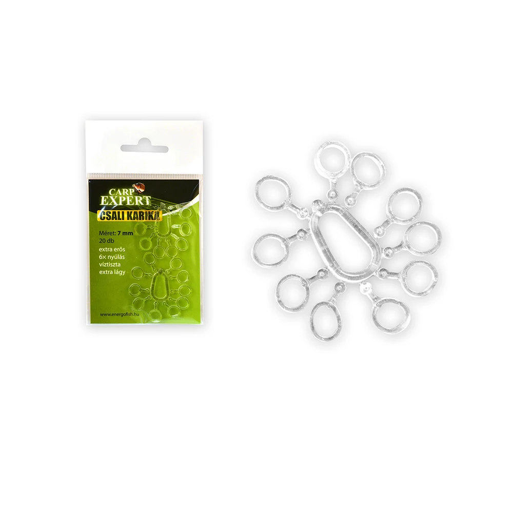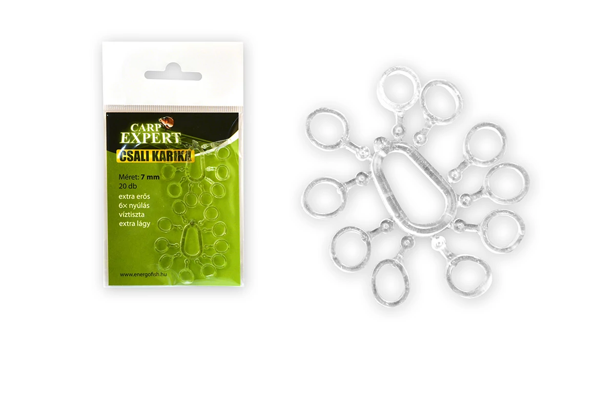 A Carp Expert csaligumi kimondottan lágy teljesen áttetsző szilikonból készül. Használatával jelentősen megnő a fogási esély, hiszen a horog gyakorlatilag szabadon marad, így az akadás sokkal tisztább, és hatékonyabb. Kétféleképpen csalizhatuk a karikával: - Amennyiben fúratlan pelletet használunk, helyezzük azt a gyűrű belsejébe, ügyelve, arra hogy a karika csali közepén fusson végig. - Ha fúrt pellettel, vagy kukoricával horgászunk, egy fűzőtűvel húzzuk keresztül a karikát a csali belsején, majd az áthúzott végén egy stopperrel ütköztessük meg azt. Ezután nincs más dolgunk, mint a gumi apró lukas végét a horog szárára húzzuk. Így csalink szabadon mozog a vízárammal, megtévesztve még a legrutinosabb pontyokat is.