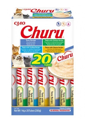 Ízletes, gabonamentes, alacsony kalóriatartalmú macskáknak szánt jutalomfalat, mely 100 %-ban tiszta és természetes vadvízi tonhalból készül! A Ciao Churu magas nedvességtartalommal rendelkezik, hogy a macskák egészségesek maradjanak. Hozzáadott E-vitaminnal, hogy támogassa macskája immunrendszerét, és zöld-tea kivonattal, mint természetes antioxidánssal. Minden ízletes, krémes Churu tubus 88 % nedvességet és mindössze 6 kalóriát tartalmaz (a hagyományos száraz macskacsemege kalóriájának egytizedét), ami egészséges nassolássá teszi, hogy macskája jól érezhesse magát minden etetésekor.