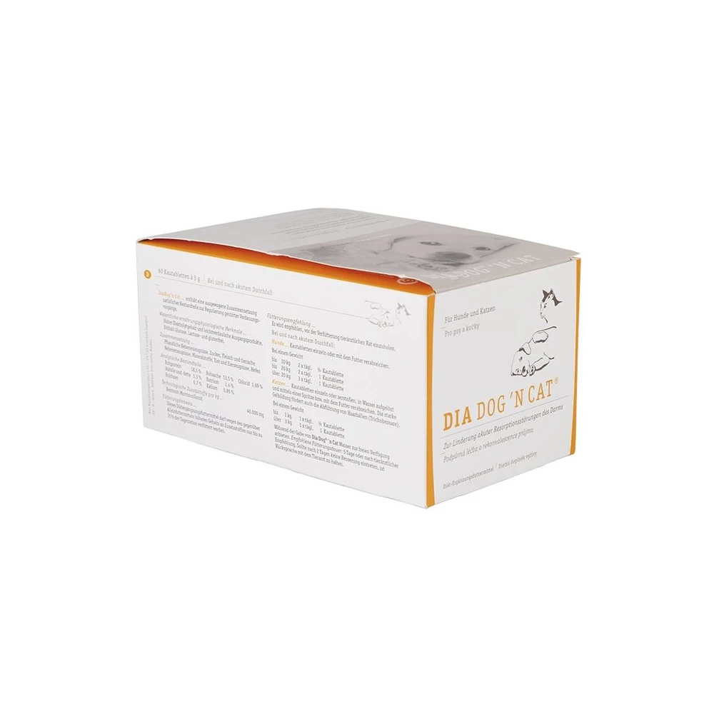 Dia Dog `n Cat Kiegészítő takarmány a heveny bélrendszeri panaszok csökkentésére kutyáknak és macskáknak Gyors segítség heveny hasmenésre – természetes összetevőkkel a bélrendszer támogatására A Dia Dog `n Cat rágótabletta hatékony segítséget nyújt kutyád vagy macskád számára, ha hirtelen fellépő hasmenéssel küzd. Olyan összetevőket tartalmaz, amelyek célzottan támogatják az emésztőrendszer megnyugtatását, a bélflóra regenerálását és az elektrolitok pótlását. Praktikus adagolása révén könnyen alkalmazható, még válogatós kisállatoknál is. Komplex hatás természetes összetevőkkel a bélrendszer egészségéért A Dia Dog `n Cat tabletta olyan gondosan válogatott hatóanyagokat tartalmaz, mint: - Propectinek – természetes gélképző anyagok, melyek védőbevonatot képeznek a bélfalon, megkötik a káros baktériumokat és toxinokat, és segítenek megelőzni a túlzott elsavasodást. További jótékony hatásuk, hogy segítik a szőrlabdák kialakulását a macskáknál. - Oligoszacharidok – serkentik a jótékony bélbaktériumok szaporodását, ezzel hozzájárulnak a bélflóra egyensúlyának visszaállításához. - Elektrolitok és szerves savak – pótolják az elveszített ásványi anyagokat, és segítenek megelőzni a kiszáradást és metabolikus acidózist. - Könnyen emészthető tápanyagok – gyors energiával támogatják a szervezetet a regeneráció során. Mikor ajánlott a Dia Dog `n Cat? - Heveny hasmenés esetén vagy azt követően - Emésztési zavarok enyhítésére - Bélflóra regenerálására antibiotikumos kezelés után - Szőrlabdák megelőzésére (cicáknál) Adagolási útmutató A tabletta önmagában, összetörve eleségbe keverve, vagy akár vízben feloldva fecskendővel is beadható. Ajánlott napi adagolás: Kutyáknak: - 10 kg alatt: napi 2×1 tabletta - 10–20 kg: napi 2×1 tabletta - 20 kg felett: napi 3×1 tabletta Macskáknak: - 3 kg-ig: napi 1×1 tabletta - 3 kg felett: napi 1×1 tabletta Az alkalmazás időtartama: minimum 5 nap vagy állatorvosi utasítás szerint. Ha az állapot 2 nap alatt nem javul, mindenképpen fordulj állatorvoshoz! A készítmény nem helyettesíti a szakszerű állatorvosi kezelést. A tabletta adagolásával egyidejűleg mindig gondoskodj bőséges ívóvízról kedvencednek. Összetétel: Gyümölcskivonatok, gumós és gyökeres zöldségek feldolgozása során keletkező melléktermékek, hús, hal, tojás, tej és feldolgozási melléktermékeik, növényi melléktermékek, szőlőcukor, ásványi anyagok, nátrium-citrát. Beltartalom: Nyerszsír 4,4% Nyersfehérje 22,3% Nátrium 2,7% Nyershamu 12,2% Nyersrost 7,2% Kálium 1,3% Sósavval nem oldható hamu 6,6%. Adalékanyagok: Bentonit-montmorillonit 40.000 mg/kg Betain 4.000 mg/kg