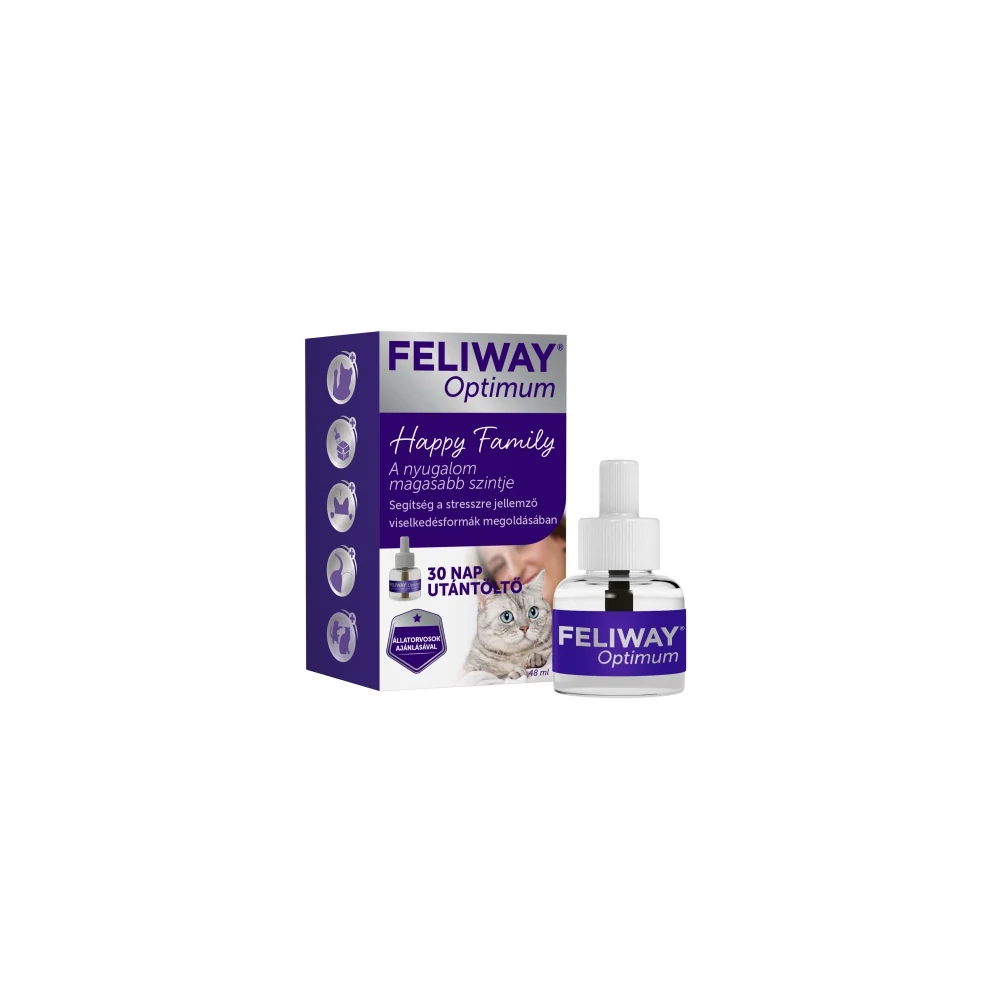 A feromonok új generációja: A macskák természetes módon maguk is termelnek feromonokat, melyek egy része láthatatlan, megnyugtató üzenetet hordoz. A FELIWAY® Optimum a legkorszerűbb macskaferomon komplexet tartalmazza, amelyet a FELIWAY® kutatócsoport fejlesztett ki. Ez az újgenerációs feromon komplex a nyugalom erős üzenetét közvetíti, ezzel segítve a macskákat, hogy nagyobb kényelemben és biztonságban érezhessék magukat otthon, és biztosítja az együtt élő macskák közötti harmóniát. A FELIWAY® Optimum a legfejlettebb macskaferomon komplex révén a legteljesebb megnyugtató üzenetet biztosítja a macskák számára. A FELIWAY® Optimum számos helyzetben segít a stressz több jelét is mutató macskáknak, minden eddiginél teljesebb nyugalmat adva számukra.