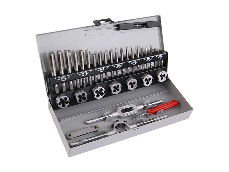 FESTA Menetfúró és metsző készlet (kézi) 32 részes HSS M3-M12-ig A készlet tartalma: menetfúrószárak M3-tól M12-ig 3 lépcsőben menetmetszők M3-tól M12-ig 1 lépcsőben két hajtószár egy csavarhúzó egy menetfésű