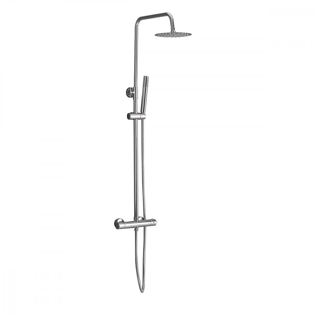 A Fury termosztátos zuhanyszett tartalmaz egy mechanikus zuhany csaptelepet hőmérséklet-keverővel, szabályozással és egy vízáram-kapcsolóval az esőzuhany és a zuhanyfej között. Az ABS króm kézi zuhanyfej és a 1,20 cm-es esőztető garantálja a tartósságot és a megbízhatóságot. A zuhanyszett elegáns esőzuhanyt és zuhanyfejet tartalmaz. A zuhanyszett teste rozsdamentes acélból készül, magassága állítható. A kézizuhany 1,5 m-es zuhanytömlővel rendelkezik.A zuhanyszettet a talajtól 85 cm-re ajánlott felszerelni.