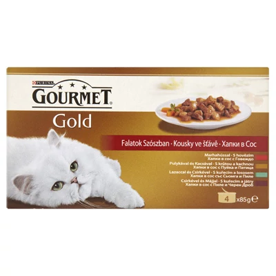 Gourmet Gold multipack - Ízletes falatok szószbanA multipack tartalma:1 db Gourmet Gold falatok szószban Pulykával és kacsával 85 g1 db Gourmet Gold falatok szószban Lazaccal és csirkével 85 g1 db Gourmet Gold falatok szószban Csirkével és májjal 85 g1 db Gourmet Gold falatok szószban Marhahússal 85 gA szakértelem és a legjobb minőségű hozzávalók megfelelő összhangja jellemzi ezt a prémium tápot.A friss összetevőknek és a fantáziadús recepteknek köszönhetően biztos lehet benne, hogy tökéletes tápot választott kedvencének.Különlegesen nagy gondot fordítunk a Gourmet alapanyagok kiválasztására és előkészítésére, hogy még ízletesebb és élvezetesebb eledel kerülhessen a cicákhoz. Emellett a szükséges tápanyagokat és vitaminokat is biztosítja, így cicája egészséges lesz és mindig vidám.Ennek az igyekezetnek köszönhető, hogy a legínyencebb legválogatósabb macskák is előnyben részesítik a Gourmet termékcsalád tagjait.Miközben nap mint nap új recepteket fejlesztünk ki, egyvalami sohasem változik: a Gourmet Gold konzervek minden egyes darabja tökéletes eledelt rejt.