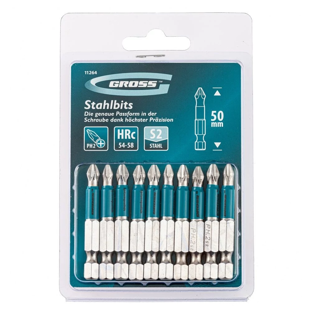 A Gross márka garancia a tökéletességre. A márka származási országa Németország. A Gross termékek mindegyike kiváló alapanyagokból, remek kidolgozással, strapabíró de kényelmes felhasználói élményt nyújtó alkalmazásokra készült. A 11264 10 db cserélhetõ Phillips aljzatból áll, 1/4-es hatszögletû szárral, amelyeket csavarhúzóval való munkavégzésre terveztek. Professzionális szerszám a menetes csatlakozások gyors felszereléséhez és szétszereléséhez PH2-es foglalattal.Elõnyök: Tartósság és kopásállóság – a bitek nagy szilárdságú japán S2 ötvözött acélból készülnek, 54-58 HRC keménységig edzettek.Mindegyik fej nikkelezett a korrózió elkerülése érdekében.A résen lévõ bevágások megakadályozzák a bitek elcsúszását és lenyalását, emellett a facsavarokkal való munkavégzés során is fokozzák az irányítást, ez a megoldás jelentõsen megnöveli a fúvókák élettartamát.A mágnesezett rés megkönnyíti a munkavégzést - a rögzítõelemet tartja, így szabad kézzel foghatja a rögzített felületet.Nagy teljesítmény szûk helyeken is – az 50 mm-es bitek kiterjesztett profiljának köszönhetõen kényelmes a nehezen elérhetõ helyeken is.10 darab egy készletben - egy csomag egy egész brigádnak elég.Kényelmes csomagolás - a fúvókákat buborékfóliában szállítjuk euróakasztóval.