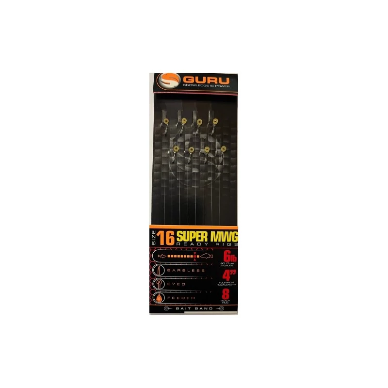 Guru Super MWG előkötött horog, pelletkarikával ellátva, 10cm-es hosszban. A horgok kiváló minőségű N-Gauge monofil zsinórra vannak kötve. Kiszerelés: 8db/csomag
