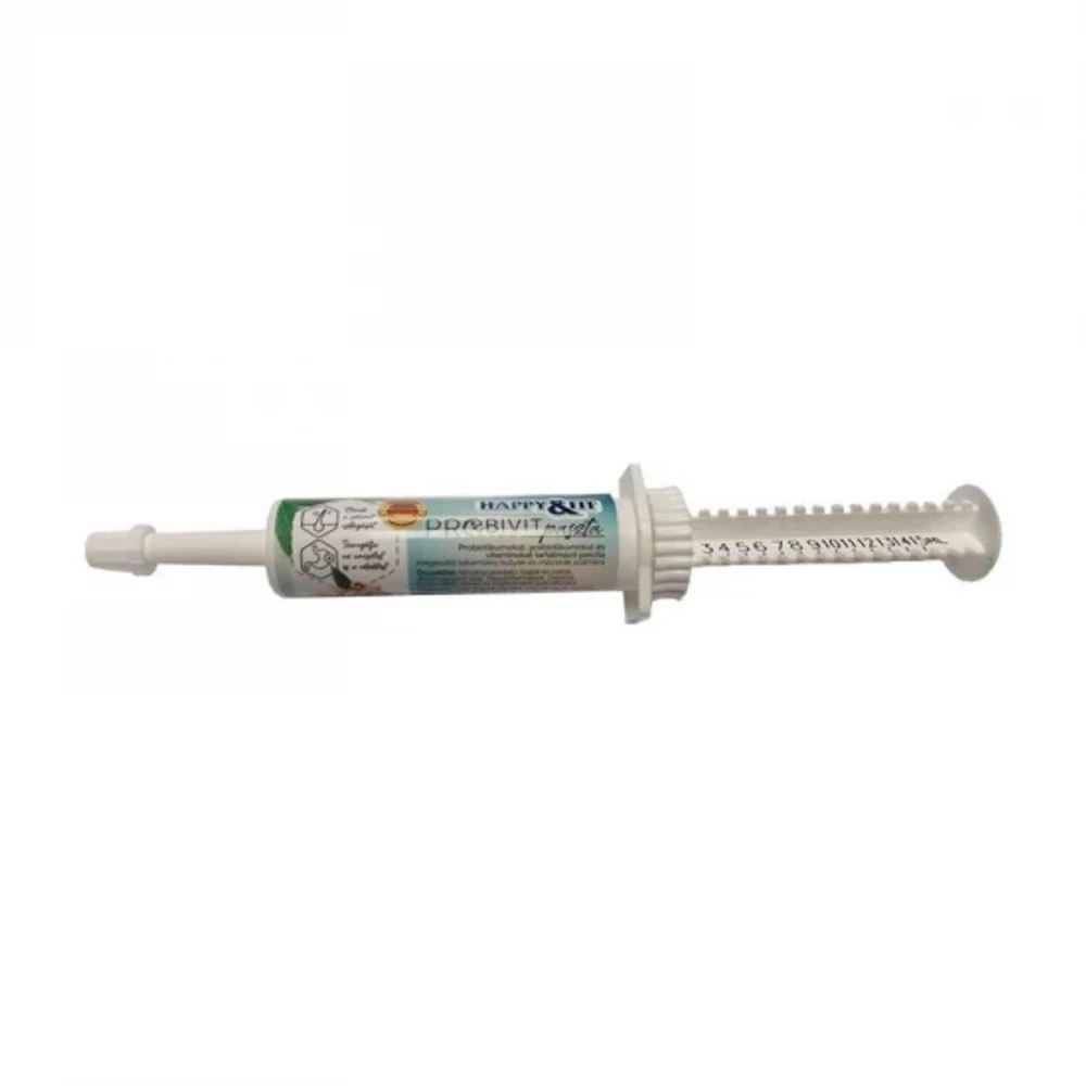 Probiotikumokat, prebiotikumokat és vitaminokat tartalmazó paszta, mely enyhe bélzavar, fokozott stresszhelyzet esetén alkalmazható. Kiegészítő takarmány kutyák és macskák számára. Összetétel: Növényi eredetű olajok és zsírok (földimogyoró olaj), Élesztőtermékek, Dextróz, Észterifikált mono-és trigliceridek (palmitinsav) Táplálási útmutató: A magas D vitamin tartalom miatt ne alkalmazza a napi eledel 2%-ánál nagyobb arányban! Adalékanyagok/kg: Tápértékkel rendelkező adalékanyagok: A-Vitamin: 1 000 000 N.E., B1-Vitamin: 2000 mg, B2-Vitamin: 2900 mg, B12-Vitamin, mint Cyanocobalamin: 30 µg, C-Vitamin: 25000 mg, D3-Vitamin: 75000 N.E, E-Vitamin (alfa-Tokoferil acetát): 15000 mg, Niacinamid: 3000 mg, Biotin: 150 mg. Zootechnikai adalékanyagok: Enterococcus faecium (DSM 10663/NCIMB 10415) (4b1707) 5,5 x 1011 CFU Beltartalom: Nyersfehérje: 5.2% Nyersrost: 0.1% Nyerszsír: 67.6% Nyershamu: 4.1% Minőségmegőrzés, tárolás: Gyártástól számított 12 hónapig, hűvös (5°C-25°C), száraz helyen tárolva. Felbontás után állítva tárolja a potenciális csepegés megelőzése érdekében. Kerülje el a fecskendő hosszabb idejű nyitvatartását. Stresszhatás esetén a paszta 8 napos periódusban naponta adandó. A skálán a kijelző egy egységgel történő elmozdítása 0,5 ml-t jelent.