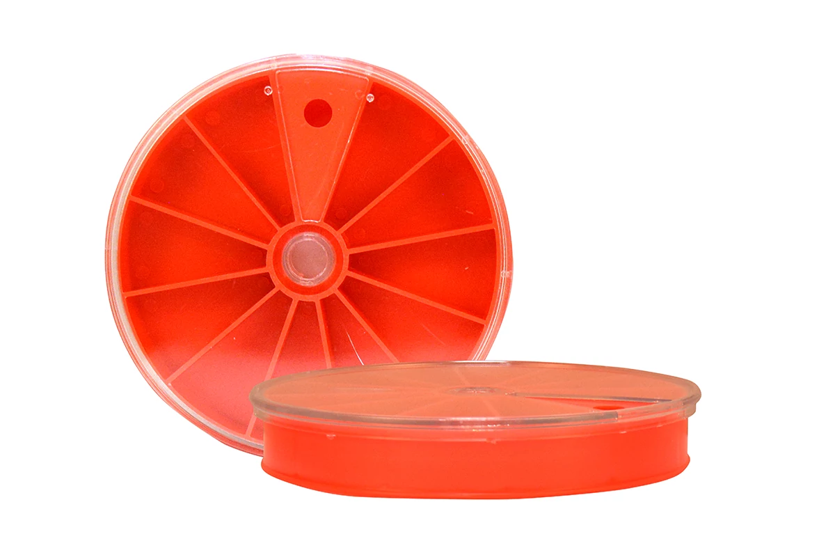 Nagyméretű, kör alakú horgos doboz, 11 fakkal, forgatható tetővel. A tetőn lévő ablak mérete pontosan igazodik a fakkok szélességéhez, így a tároló rekeszekből nem szóródhatnak ki, és nem keveredhetnek össze a horgok. A doboz átmérője 14 cm, magassága 2 cm.
