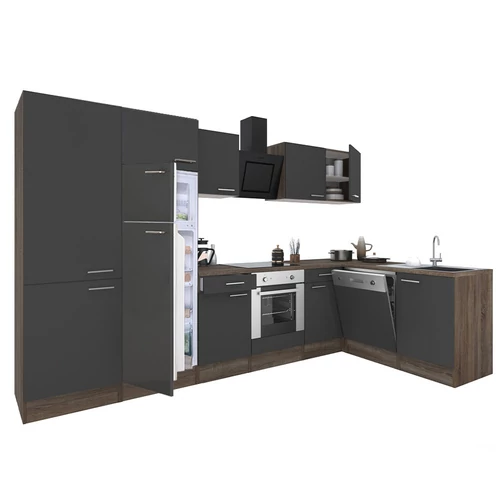 Yorki 340 sarok konyhabútor yorki tölgy korpusz,selyemfényű antracit front alsó sütős elemmel polcos szekrénnyel, felülfagyasztós hűtős szekrénnyel