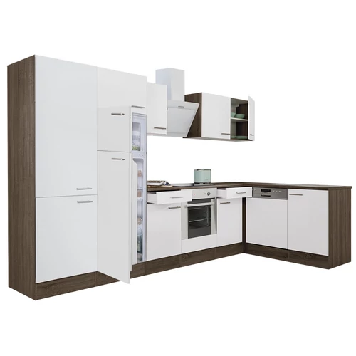 Yorki 340 sarok konyhabútor yorki tölgy korpusz,selyemfényű fehér front alsó sütős elemmel polcos szekrénnyel, felülfagyasztós hűtős szekrénnyel