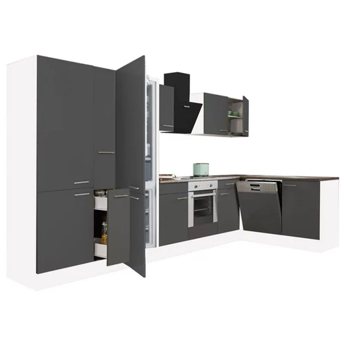 Yorki 370 sarok konyhabútor fehér korpusz,selyemfényű antracit front alsó sütős elemmel polcos szekrénnyel, alulfagyasztós hűtős szekrénnyel