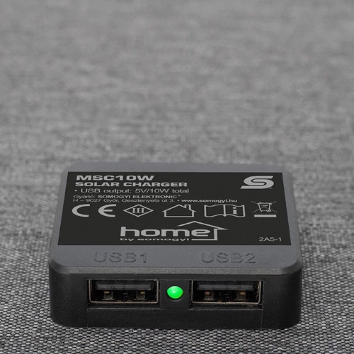 HOME MSC10W hordozható napelemes USB töltő, összecsukható, 10Watt, 2xUSB, LED töltésjelző, felakasztható, tartozék karabinerekkel