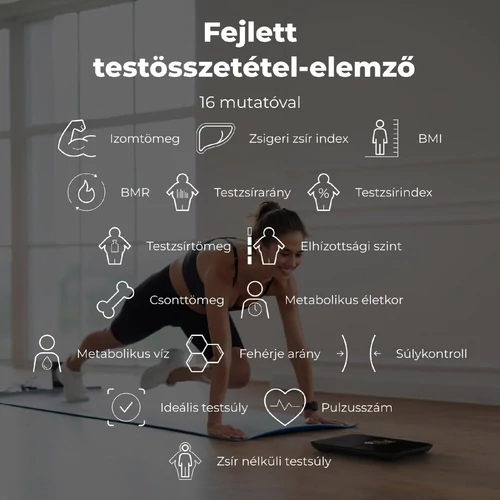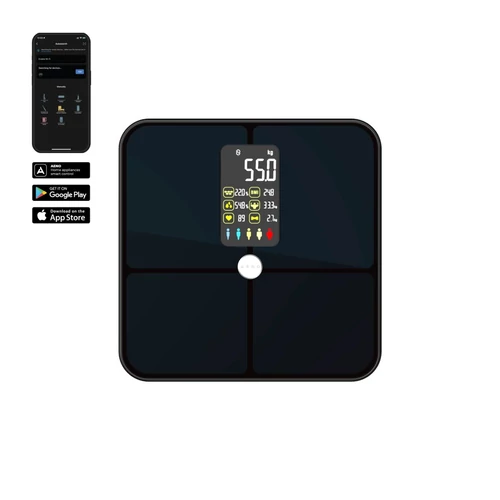 AENO ABS0002S BS2S testmérleg, 180 kg-ig terhelhető, SMART funkciók, profilok, BMI index elemzés, színes kijelző