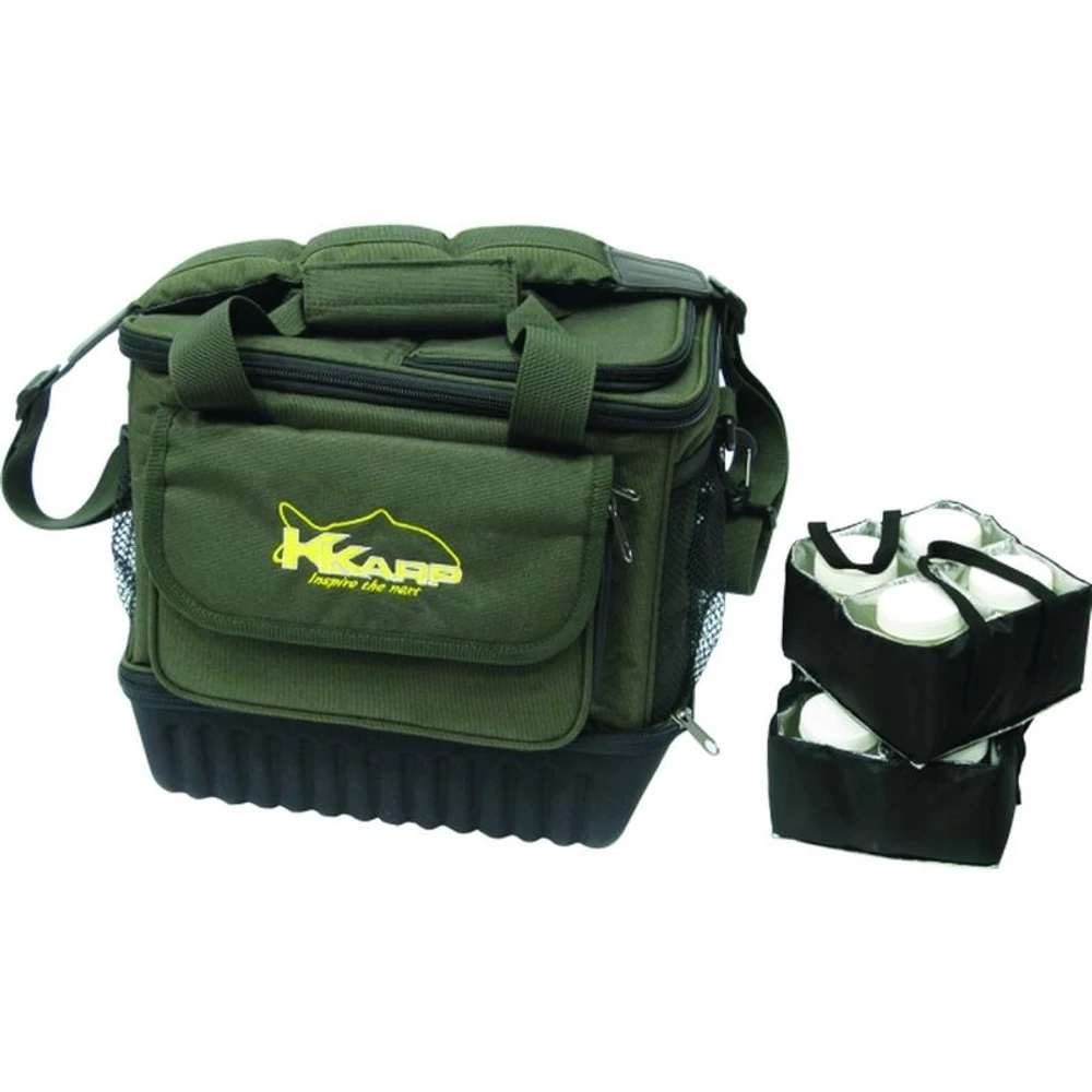 Cipzárral zárható hűtőtáska. Részlegesen nyitható, ezzel még hatékonyabb a belső hőmérséklet védelme. Két eltávolítható tálcája van. Mindegyik négy csavaros tetővel ellátott csalitartót tartalmaz. A táska 4kg bojli tárolását teszi lehetővé. A táska alja EVA borítást kapott, ami nagymértékben megnöveli a táska védelmét. A belső és külső zsebek számtalan kisebb-nagyobb eszköz tárolására alkalmasak. A táska befoglaló mérete:29*30*20 cm