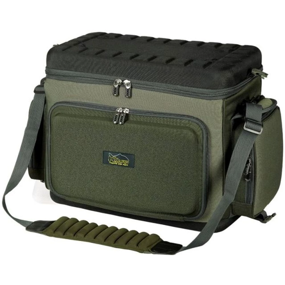 A K-KARP csapata tervezte hosszabb horgászatokra és változó körülményekre ezt a szereléktartó táskát. A felső és alsó része vízálló és ütéscsillapító anyagból készült. A fedő rész teljesen eltávolítható, így kényelmesen hozzáférhetűnk a fő tároló rekeszhez. Emellett a táska elején lévő zippzárral nyitható rés segítségével hozzáférhetünk a táskában tárolt eszközökhöz is anélkül, hogy a felső nyílást használnánk. Két oldalzseb kiváló hely a kisebb eszközök tárolására, míg a központi tároló részben akár K-KARP dobozok is kényelmesen elférnek. A táska vállon is szállítható. A kényelemről az ergonomikusan kialakított vállpánt gondoskodik. Mérete: 62*31*42 cm