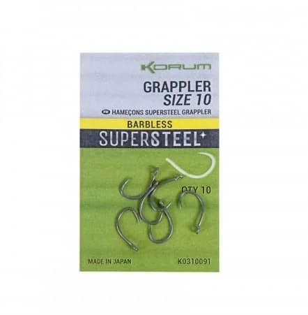 Supersteel Grappler horogcsalád Ezt az agresszív, ívelt szárú horgot úgy tervezték, hogy tökéletes akadást biztosítson a finomabban táplálkozó halak esetén is. Hegye visszafelé ívelt, míg a horogszem enyhén kifelé döntött, hogy tökéletesen használható legyen monofil előkék kötésénél is. Teflon bevonata és kémiailag élezett hegye ellenállóvá teszi a keményebb terepen is. Megvásárolható szakállas és szakáll nélküli kivitelben egyaránt.