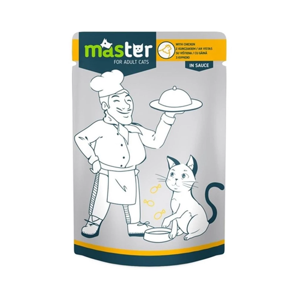 MASTER - teljes értékű, szaftos eledel felnőtt macskáknak - csirkés Összetétel: hús és állati eredetű melléktermékek, beleértve legalább 4% csirkét, gabonafélék, ásványi anyagok, növényi fehérje kivonatok. Analitikai alkotóelemek: fehérje 7%, nyersolajok és zsírok 4%, nyershamu 2,5%, nyersrost 0,3%, nedvességtartalom 82%, kalcium 0,35%, foszfor 0,25%. Adalékanyagok (1 kg-onként): Táplálék –adalékanyagok: D3-vitamin (3a671):135 NE; E-vitamin (3a700): 8,99 mg, B1-vitamin(3a821):0,6 mg, folsav (3a316): 0,17 mg, taurin(3a370):356 mg, kálium-klorid (3a890):243,6 mg, kolin-klorid (3a890) :1,26 g, nyomelemek: cink-szulfát heptahidrát (3b604): 5,21 mg, glicin (2b17034): 2,9 g. Technológiai adalékanyagok: guargumi 1,1 g. Érzékelő adalékok: élelmiszer-színezékek. Metabolizálható energia 100 g-onként: 309,6 kJ (74 kcal).