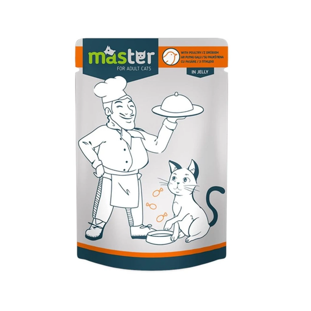 MASTER -teljes értékű, szaftos eledel felnőtt macskáknak- szárnyas Összetétel: hús és állati eredetű melléktermékek, beleértve nem kevesebb mint 4 % szárnyast, gabonafélék, ásványi anyagok, növényi fehérje kivonatok legalább 4% -át. Analitikai alkotóelemek: nyersfehérje - 7%, nyers olajok és zsírok - 4%, nyershamu - 2,5%, nyers rost - 0,3%, nedvességtartalom - 82%, kalcium - 0,35%, foszfor - 0,25%. Adalékanyagok (1 kg-onként): Táplálék-adalékanyagok: D3-vitamin (3?671): 135 NE; E-vitamin (3a700): 8,99 mg, B1-vitamin (3?821): 0,72 mg, folsav (3a316): 0,17 mg, taurin (3a370): 356 mg, kolin-klorid (3a890): 1,26 g, nyomelemek: cink (cink-szulfát-heptahidrát 3b604): 3 mg. Technológiai adalékanyagok: Xantángumi (?415): 0,5 g, tara-gumi (E412): 2,1 g, karrageen kappa (?407): 2,9 g. Érzékelő adalékanyagok: színezékek, glicin (2b17034): 2,6 g. Metabolizálható energia 100 g állateledel: 309,6 kJ (74 kcal).