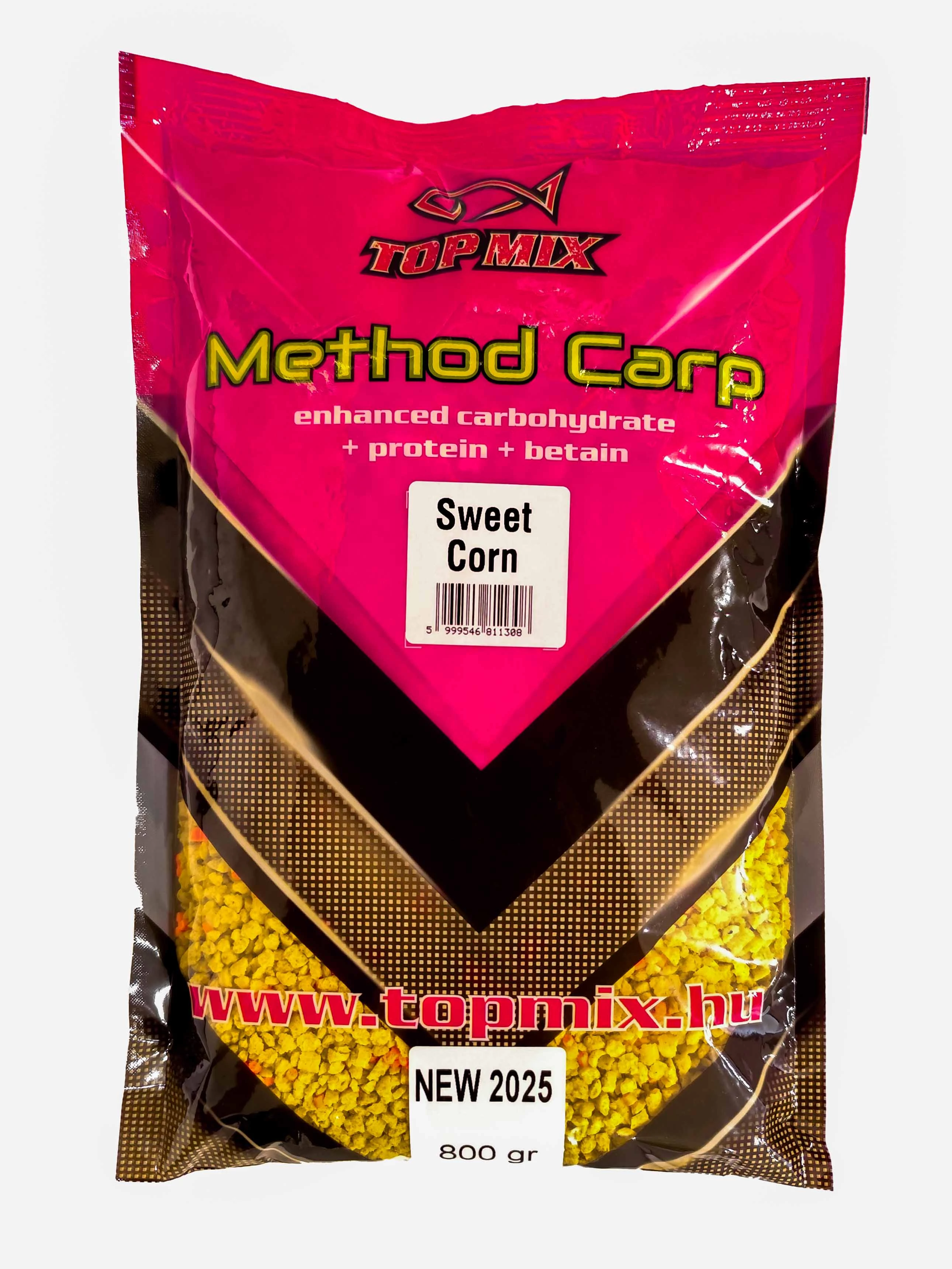 A Method Carp etetők jellemzője, hogy a finom szemcséket lecseréltük nagyobb méretűre és nyers összetevőket nem használunk a gyártásánál. Sok benne a színes, a halak kíváncsiságát is felkeltő szemcse. Az új gyártástechnológiából adódó összetevők, a nagyobb szemcseméret igen gyors bontást eredményeznek és segítenek abban, hogy az igazi nagytestű halakat is horogra tudjuk csalni. Megfelelő nedvesítés mellett az etetők tapadása és bontása is tökéletes. A jól kiegyensúlyozott beltartalom (szénhidrát, protein, betain) vonzó táplálék lehet a pontyoknak, pontyféléknek, minden évszakban. Kellemes édeskukorica aromája, feltűnő színe és szemcsemérete mellett beltartalmi értéke is tovább fokozza csalogató hatását, köszönhetően a benne található szénhidrát, protein és betain tartalomnak. Igazi ponty csemege, vadvízen és intenzív tavakon egyaránt!