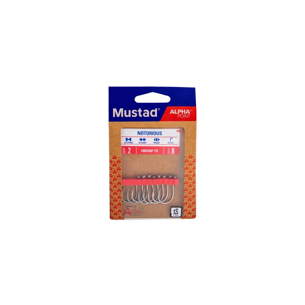 A Notorious Hook kifejezetten nagy csalikhoz lett tervezve, hagyományos "polip" alakot kapott, maximális akadási tulajdonságokkal. Az AlphaPoint 4.8 Technology, a legújabb tűhegyes innováció, ötvözi a Mustad Opti-Angle élezési technikájának tartósságát és a kivételes élességet. Az eltolt szár és keskenyebb hegy-szár távolság szinte lehetetlenné teszi, hogy a hal kifújja a horgot. A Mustad Titan Steel bevonatot alkalmazott, amely 500+ órás sósvízi korrózióállóságot biztosít!