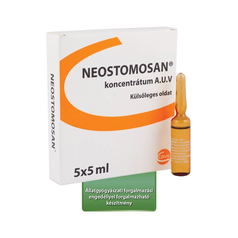 Hatóanyag: Transzmix (theta-cipermetrin), Tetrametrin Célállat faj: kutya Javallat: kutyákban Sarcoptes rühösség, Otodectes fülrühösség, lokalizált demodicosis, bolhásság, tetvesség és kullancs fertőzöttség megelőzésére és kezelésére Adagolás: a készítmény 200-szoros hígításban kell használni lemosással, permetezéssel vagy fürösztéssel. A kezelést 7 nap múlva meg kell ismételni Kiszerelés: 5x5 ml, 100x5 ml, 200 ml, 1 liter 1.AZ ÁLLATGYÓGYÁSZATI KÉSZÍTMÉNY NEVE Neostomosan koncentrátum A.U.V. 2.MINŐSÉGI És MENNYISÉGI ÖSSZETÉTEL 100 ml készítmény tartalmaz: Hatóanyagok: Transzmix (theta-cipermetrin)5,0 g Tetrametrin0,5 g Segédanyagok: A segédanyagok teljes felsorolását lásd: 6.1 szakasz. 3.GYÓGYSZERFORMA Külsőleges oldat 4.KLINIKAI JELLEMZÓK 4.1Célállat faj(ok) Kutya 4.2Terápiás javallatok célállat fajonként Sarcoptes rühösség, Otodectes fiilrühösség, lokalizált demodicosis, bolhásság, tetvesség és kullancs fertőzöttség megelőzésére és kezelésére. 4.3Ellenjavallatok Nem alkalmazható a készítmény hatóanyagaival, vagy bármely segédanyaggal vagy vivőanyaggal szembeni túlérzékenység esetén. 4.4Különleges figyelmeztetések minden célállat fajra vonatkozóan Nincsenek. 4.5• Az alkalmazással kapcsolatos különleges óvintézkedések A kezelt állatokra vonatkozó különleges óvintézkedések A kutyákat a kezelés után 3 napig nem szabad úsztatni. Az állatok kezelését végző személyre vonatkozó különleges óvintézkedések A készítmény tűzveszélyes! Használata során védőruha, védőkesztyú, védő szemüveg, permetezés esetén maszk viselete javasolt. Kerülni kell, hogy a koncentrátum vagy a munkaoldat a munkát végzők szemébe, bőrére jusson, vagy a permetlét belélegezzék. A bőrre vagy a szembe került anyagot bő vízzel mossuk le, továbbá a készítmény szembe jutása vagy lenyelése esetén a használati utasítással együtt haladéktalanul forduljunk orvoshoz. 4.6 Mellékhatások (gyakorisága és súlyossága) Nem ismert. 4.7 Vemhesség, laktáció vagy tojásrakás idején történő alkalmazás Az állatgyógyászati készítmény ártalmatlansága nem igazolt vemhesség és laktáció Kizárólag a kezelést végző állatorvos által elvégzett előny/kockázat elemzésnek megfeleĹden alkailňazható. 4.8 Gyógyszerkölcsönhatások és egyéb interakciók Nem ismert. 4.9 Adagolás és alkalmazási mód Külsőleges alkalmazásra. Lemosással, fürösztéssel vagy permetezéssel történő kezeléshez a koncentrátumot 1:200 arányban kell hígítani (5 ml készítmény/l liter víz). Bolhásság és tetvesség esetén a teljes testfelületet és az állatok közvetlen környezetét is permetezni kell. A kezelést 7 nap múlva meg kell ismételni. A kullancsok a kezelés után néhány órán belül lehullanak. Sarcoptes rühösség és lokalizált demodicosis esetén a kezelést IO naponként addig kell ismételni, amíg két egymást követő bőrkaparék vizsgálat negatív eredményt nem ad. Otodectes fiilrühösség esetén a munkaoldatot a fülkagyló és a külső hallójárat elváltozást mutató területeire juttatjuk. Mindkét fület kezelni kell. A kezelést 7 nap múlva meg kell ismételni. 2. 4.10 Túladagolás (tünetek, sürgősségi intézkedések, antidotumok), ha szükséges Toxikózis esetén nyálzás, hányás, hasmenés, remegés, izgatottság/tompultság jelentkezhet. Görcsök esetén diazepam adása javasolt. 4.11 Élelmezés-egészségügyi várakozási idő(k) Nem értelmezhető. 5.FARMAKOLÓGIAI TULAJDONSÁGOK Farmakoterápiás csoport: Piretrinek, piretroidok. Állatgyógyászati ATC kód: QP53AC13 5.1 Farmakodinámiás tulajdonságok A Neostomosan koncentrátum A.U.V. hatóanyagai a piretroidok csoportjába tartozó transzmix (theta-cipermetrin) és a tetramefrin. A kombináció az ízeltlábúakra erős izom-és idegméregként ható, taglóhatással ("knockdown”) rendelkező kontaktméreg. Hatását az által fejti ki, hogy a Na csatornákra hatva az idegsejtek membránját depolarizálja. A készítmény összetétele segíti a piretroidok hatásának erősségét és tartósságát. Az előírt hígításban melegvérű állatokra és az emberre ártalmatlan. 5.2 Farmakokinetikai sajátosságok A transzmix és a tetrametrin a kezelt állatok bőréről kis mértékben felszívódik. 5.3 Környezeti tulajdonságok Halakra és méhekre a készítmény mérgező, élővizekbe jutva a vízi élőlényekre ártalmas. 6.GYÓGYSZERÉSZETI SAJÁTOSSÁGOK 6.1Segédanyagok felsorolása Piperonil-butoxid Ecetsavanhidrid Butilhidroxitoluol Geronol FF4 (Emukon AG/L) Geronol MS /(Emulson AG/MS) Folyékony paraffin Nehéz aromás oldószer nafta 6.2Inkompatibilitások Kompatibilitási vizsgálatok hiányában ezt az állatgyógyászati készítményt tilos keverni más állatgyógyászati készítménnyel. 6.3Felhasználhatósági időtartam A kereskedelmi csomagolású állatgyógyászati készítmény felhasználható: 3 évig. A közvetlen csomagolás első felbontása után felhasználható: 6 hónapig. Az előírás szerinti hígítás után azonnal felhasználandó. 6.4 Különleges tárolási előírások 25 0C alatt, fénytől védve tárolandó. Fagyástól óvni kell. Hőhatástól védve, gyúlékony anya"tól távoltartandó. 6.5 A közvetlen csomagolás jellege és elemei 5 x 5 ml üveg ampullában, papírdobozban. 100 x 5 ml üveg ampullában, papírdobozban. 200 ml, polietilén kupakkal lezárt polietilén flakonban. I liter, polietilén kupakkal lezárt polietilén flakonban. Előfordulhat, hogy nem minden kiszerelés kerül kereskedelmi forgalomba. 3. 6.6 A fel nem használt állatgyógyászati készítmény vagy a készítmény felhasználásából származó hulladékok megsemmisítésére vonatkozó különleges utasítások Halakra és méhekre mérgező. A fel nem használt állatgyógyászat