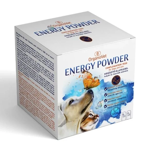 A készítmény összetétele - Dextróz, hidrolizált csirkemáj, maltodextrin, nátrium-klorid, kálium-klorid, élesztő (béta glükán 1-3 1-6). Adalékanyagok (mg/kg) Aromaanyagok: - 2b17034 Glicin 66666,7mg - 2b16056 Taurin 3000mg - Aminosavak, sóik és analógjaik: - 3c451 Glutamin 31666,7mg Vitaminok: - 3a315 Niacinamid (B3 Vitamin) 88,3 mg - 3a831 B6-vitamin 8,3mg - 3a820 B1-vitamin 11,67mg Célállatfajok - kutya, macska A készítmény felhasználási területének rövid leírása, felhasználási javaslat Az OrganoVet Energy Powder 10 x 30 g tápanyagokkal látja el a bélrendszert, mellyel támogatja az egészséges bélflóra kialakítását, ezzel erősíti a kutyák és macskák immunrendszerét. A nem megfelelően működő bélrendszer felszívódási zavarokhoz vezet, melyek tünetei általában a fogyás jó étvágy mellett, hányás, gyakori bűzös széklet, depresszió, hányás és krónikus hasmenés. Ebben nyújthat megoldást az OrganoVet Energy Powder 10 x 30 g, amely gyorsan ható folyékony táplálás. Izotóniás és elektrolit támogatással regenerálja az állat szervezetét. - Glicin: •csökkenti az artrózist, csontritkulást és a degeneratív betegségek kialakulásának kockázatát kutyáknál. - Nátrium-klorid:•támogatja a sejtfunkciókat, így a folyadékegyensúlyt és az idegsejtek közötti kommunikációt - L-glutamin: •támogatja a bélrendszerben lévő sejtek regenerálódását, így segíthet a hasmenés gyógyításában - Béta glükán: •támogatja az immunrendszert azáltal, hogy segít helyreállítani a bélrendszer működését - B1 vitamin: •segíti az energia- és szénhidrátanyagcserét - B6 vitamin: •segíti a glükóztermelést, a vörösvértestek és az idegrendszer működését, valamint támogatja az immunrendszert - B3 vitamin: •támogatja az enzimek működését - Kálium-klorid: •megakadályozza a kiszáradást - Taurin: •a macskák szervezetében is megtalálható aminosav, amely fontos szerepet játszik az epesav konjugációban, a retina és a szívizom működésében Etetési javaslat és az alkalmazás módja A tasak tartalmát oldja fel 500 ml meleg vízben. Hidratáció támogatása: Kutya/macska: A javasolt adag 35 ml/testtömeg kilogramm 24 órán keresztül. Például egy 10 kg-os állat esetében a vizes oldat ajánlott teljes mennyisége 350 ml 24 órán keresztül adagolva. Legfeljebb 2 hétig vagy az állatorvos ajánlása szerint adható. Bélrendszer táplálkozási támogatása: kutya/macska 2 ml/testtömeg kilogramm az ajánlott adag 24 órán keresztül. Például egy 10 kg-os állat esetében a vizes oldat ajánlott teljes mennyisége 20 ml 24 órán keresztül adagolva. Szükség esetén a napi mennyiséget több részletben időben elosztva kell beadni. Folytassa az adagolást az állatorvos által javasolt módon. Gondoskodjon arról, hogy az állat számára mindig álljon rendelkezésre friss ivóvíz. Szűkség esetén a termék szájon át fecskendővel is beadható. Ivóvízhez való hozzáadás esetén mérje ki a rendelkezésre álló mennyiséget, hogy a bevitt adag nyomon követhető legyen. Óvintézkedések Kizárólag állati felhasználásra. Gyermekektől elzárva tartandó. Emberi fogyasztásra nem alkalmas. Ne lépje túl az ajánlott mennyiséget. Lejárati idő 24 hónap Tárolási előírások Hűvös, száraz helyen napfénytől elzárva tárolandó. Felbontás után hűtőben tárolva 3 napon belül használja fel. Fagyasztásra is alkalmas. Gyermekektől elzárva tartandó. Csomagolás (a tartály vagy csomagolóanyag jellege, kiszerelési egységek) 30g-os tasak „Gyermekek elől elzárva tartandó!” A fel nem használt anyag és a hulladék kezelésének módja A fel nem használt terméket, valamint a keletkező hulladékokat a helyi követelményeknek megfelelően kell megsemmisíteni.