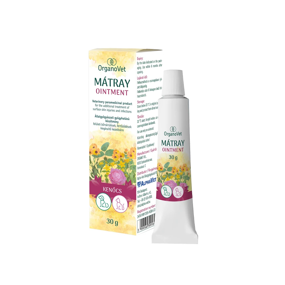 OrganoVet MÁTRAY Ointment Állatgyógyászati gyógyhatású kenőcs kutyák és macskák számára, felületi bőrsérülések és fertőződések kiegészítő kezelésére. A propoliszt, orvosi körömvirágot és orbáncfüvet tartalmazó kenőcs segíti a sebgyógyulást, csökkenti a gyulladást és megnyugtatja a sérült bőrfelületet. Hogyan hat? Az OrganoVet MÁTRAY Ointment növényi alapú összetevői nyugtatják a bőrfelületet, gyorsítják a regenerációt, csökkentik a fertőzés kockázatát és megakadályozzák a sebek kiszáradását. Rendszeres használata elősegíti a bőr rugalmas és hidratált állapotának megőrzését, ami hozzájárul a gyógyulási folyamat felgyorsításához. Mi teszi különlegessé? A MÁTRAY Ointment különlegessége abban rejlik, hogy természetes összetevőivel hatékonyan támogatja a bőr regenerációját és gyógyulását, miközben minimalizálja a mellékhatások kockázatát. Alkalmazása egyszerű, védőkötést nem igényel. Főbb tulajdonságok: - Gyulladáscsökkentő és sebgyógyulást támogató hatás - Természetes összetevők - Nem igényel védőkötést Összetétel: Unguentum hydrophylicum nonionicum, Adeps lanae, Alkohol, Solutio conservans, Orvosi körömvirág, Orbáncfű, Propolisz, Százlevelű rózsa Használati útmutató: Tisztítsd meg a bőrfelületet, majd vigyél fel vékony rétegben kenőcsöt a sérült bőrfelületre naponta 2-3 alkalommal. Kiszerelés: 30 g
