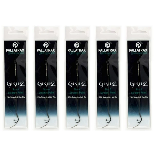 GripZ Straight Point Hair Rigs - Steamlink: Elérhető 6-os méretű Straight Point Gripz horoggal 25lb Steamlink előkén, valamint 8-as méretű Straight Point Gripz horoggal 15lb Steamlink előkén, kézzel kötve, Angliából, egyedi Steamlink bevonatos előkezsinóron. A merev, áttetsző külső bevonat és a lágy Dyneema belső mag kombinációja lehetővé teszi egy kiváló Hinge-Rig kialakítását, amely sikeresen alkalmazható pop-up és süllyedő csalikhoz egyaránt.