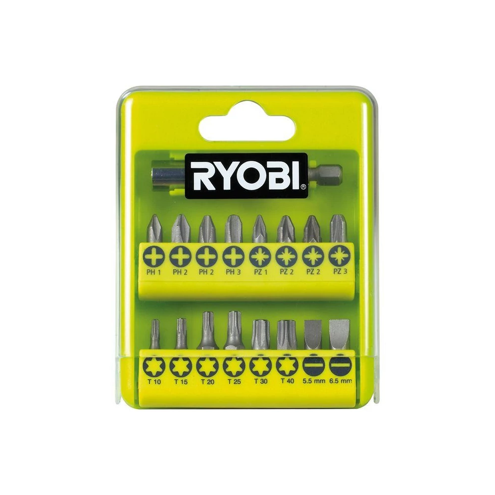 A Ryobi egy japán autó-, elektronikai- és távközlési alkatrészeket gyártó cég, de nyomdai berendezéseket, elektromos szerszámokat és építõipari eszközöket is értékesít. A Ryobi vállalat célja, hogy csúcsminõségû, innovatív termékeivel és szolgáltatásaival nélkülözhetetlenné váljon a piacon, és megfelelõ választ adjon az ügyfelek és a társadalom igényeire.25 mm-es csavarhúzó bitek: PH1 / 2 x PH2 / PH3 25 mm-es csavarhúzó bitek: PZ1 / 2 x PZ2 / PZ3 25 mm-es csavarhúzó bitek: TX10 / TX15 / TX20 / TX25 / TX30 / TX40 25 mm-es csavarhúzó bitek: SL5.5 / SL6.5 1 x mágneses bittartó