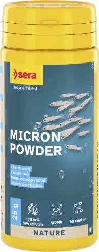A SERA Micron minden újszülött ikrarakó faj fiatal halainak ideális felnevelő elesége közvetlenül a kiúszás után. A SERA Micron magas értékű természetes nyersanyagokból áll, mint spirulina, vízibolha, cyclops, marha- és halmáj, plankton és kagylóhús. Az el nem fogyasztott SERA Micron algaszõnyeg képeződéshez vezet, melyben mikroorganizmusok fejlődnek. Ezek a mikroorganizmusok ugyancsak értékes takarmányként szolgálnak az ivadék halak számára. A SERA Micron olyan finom, hogy artemianaupliák etetésére és felneveléséhez is ideális. A SERA Micron-ból és Sera Fishtamin-ból készült eleségpép nagyobb halak (pontylazacok, márnák, elevenszülő fogaspontyok) számára is alkalmas.