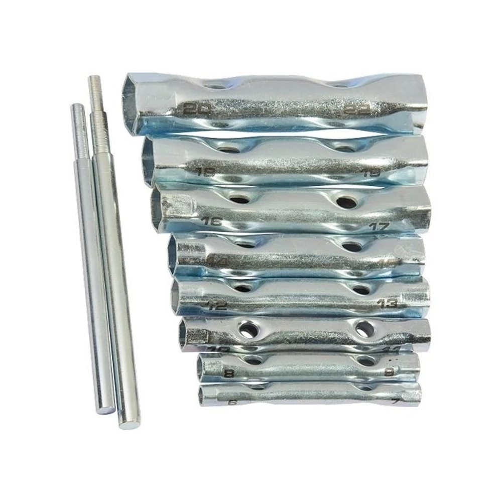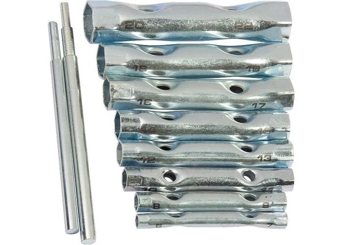 Kétoldalas csőkulcs. A kulcsok vékony falai lehetővé teszik a nehezen hozzáférhető helyekbe történő beszerelést, ha a csavarkötések jelentős mélyedésekben vannak. Szénacélból készül. A kulcs működő részének anyaga keménysége 41 HRc, amely megfelel a GOST követelményeinek. A kulcsok cinkbevonattal vannak ellátva. A készlet buborékcsomagolásban van.