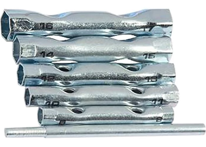 Kétoldalas csőkulcs. A kulcsok vékony falai lehetővé teszik a nehezen hozzáférhető helyekbe történő beszerelést, ha a csavarkötések jelentős mélyedésekben vannak. Szénacélból készül. A kulcs működő részének anyaga keménysége 41 HRc, amely megfelel a GOST követelményeinek. A kulcsok cinkbevonattal vannak ellátva. A készlet buborékcsomagolásban van.