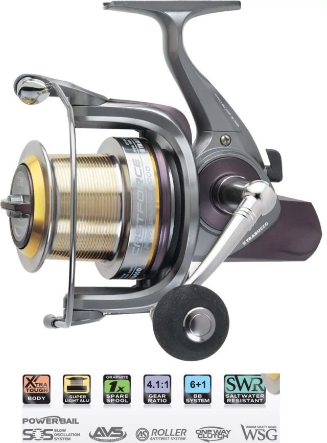 A TRABUCCO a CASTFORCE PRO SURF távdobó orsójára a nagyon kedvező ár, ugyanakkor - a versenytársakkal összevetve - sokkal jobb felszereltség jellemző. Az orsó háza és a rotor erős grafitból készült, a hajtókar alumínium és a végére harci markolatot kapott. A hidegen kovácsolt, alumíniumból készült, megnövelt belső átmérőjű dob kiváló a távolsági dobásokhoz. A dob palást alsó részének speiális kialakítása megakadályozza, hogy a zsinór még véletlenül se essen le a dob alá. A felkapókar erős, ugyanakkor könnyű alumínium csőből készült (Power Bail). Gyakorlatilag törhetlen. A megfelelő minőségű hajtásról a 6+1 db hosszú élettartamú rozsdamentes acélból készített és a kialakítása révén sós víznek is ellenálló golyóscsapágyakkal szerelt hajtómű gondoskodik.