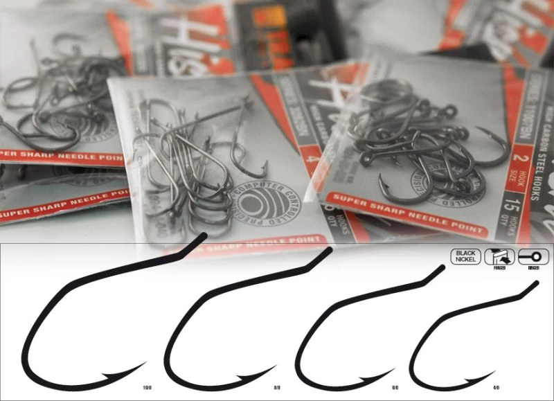 A Trabucco HISASHI családra jellemző magas karbontartalmú kovácsolt, hatalmas öblű füles horog. A különösen hosszú, kémiailag élezett, rendkívül ellenálló horoghegy, szokatlanul nagy szakállal a legádázabb csatákban megnyugtató biztonságot nyújt a fárasztás során. Az élőcsalival, extrém halakra horgászók figyelmébe ajánljuk ezt a tiszteletet parancsoló erővel bíró édes és sós vizi  használatra is alkalmas horgot.