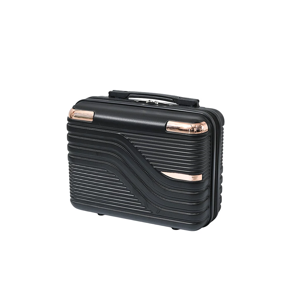 A rosegold díszítések és az ívelt, hullámos mintázat nemcsak esztétikus, hanem optikailag is „tömörebb” megjelenést kölcsönöz, így még kisebbnek hat a bőrönd – miközben belül minden elfér.