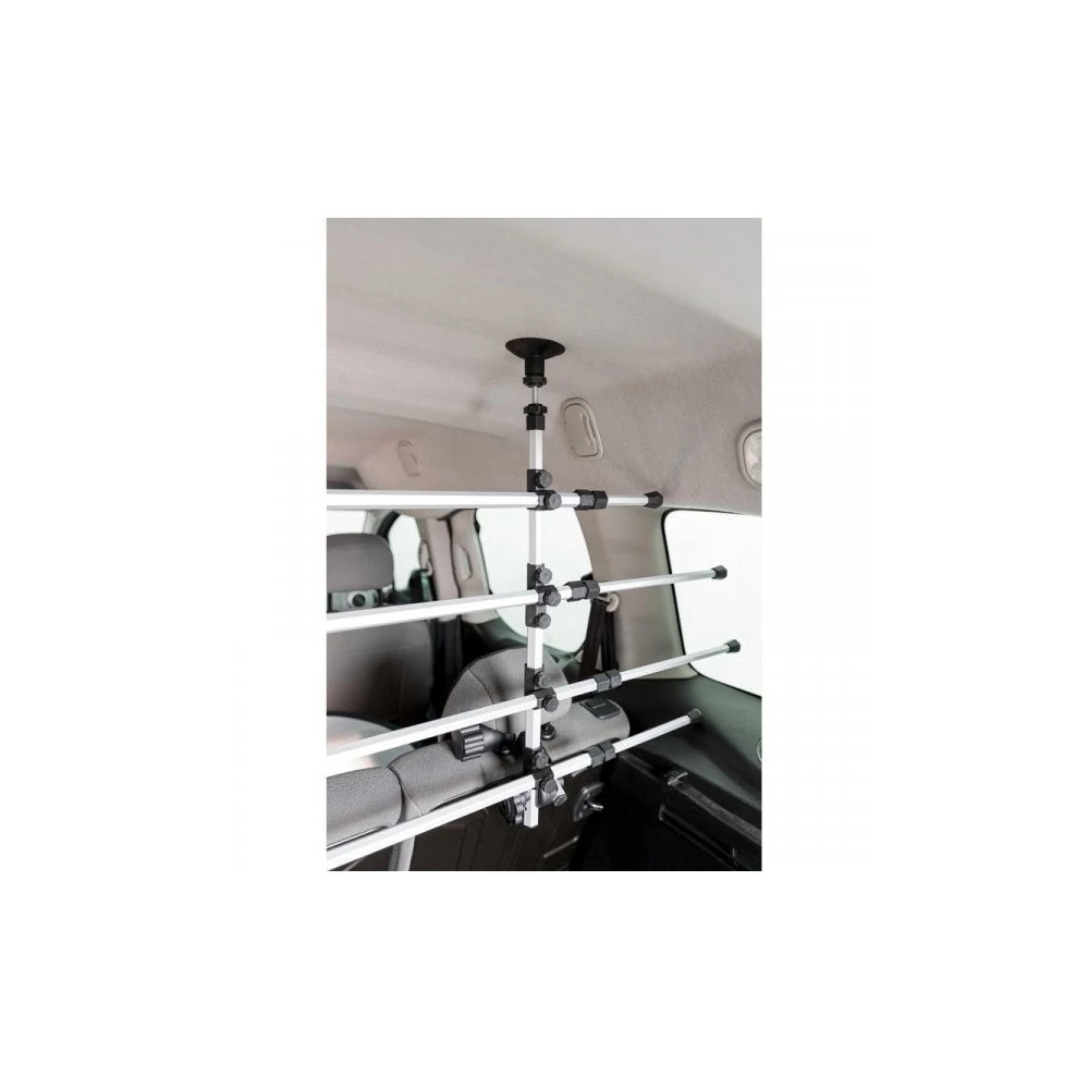 Helytakarékos módon rögzíthető a fejtámlákhoz, a teljes rakodótér kihasználható, állítható szélességben és magasságban. Könnyű súlyú, alumínium anyagú. Fontos: Az átfogó balesetvédelem érdekében használjon minősített autós biztonsági övet.