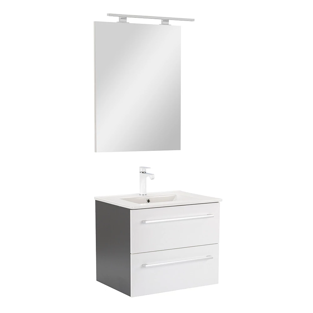 A Vario Clam 60 komplett fürdőszobabútor egy stílusos és praktikus választás modern fürdőszobához. Kompakt méretei ideálisak kisebb és közepes méretű fürdőszobákba is, és a fém fogantyú profil patinás hatást, a antracit-fehér színű dizájn elegáns megjelenést kölcsönöz a térnek. A csillapítós fiókzáródás és a felfüggesztett kivitel a kényelmet és könnyű tisztántartást szolgálja, míg a minőségi anyagok hosszú élettartamot biztosítanak.