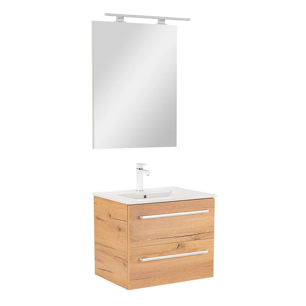 A Vario Clam 60 komplett fürdőszobabútor egy stílusos és praktikus választás modern fürdőszobához. Kompakt méretei ideálisak kisebb és közepes méretű fürdőszobákba is, és a fém fogantyú profil patinás hatást, a tölgy-tölgy színű dizájn elegáns megjelenést kölcsönöz a térnek. A csillapítós fiókzáródás és a felfüggesztett kivitel a kényelmet és könnyű tisztántartást szolgálja, míg a minőségi anyagok hosszú élettartamot biztosítanak.